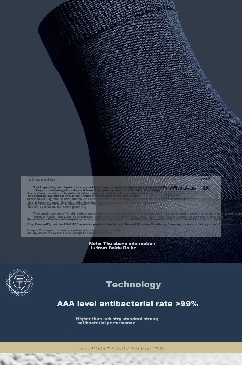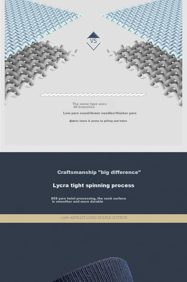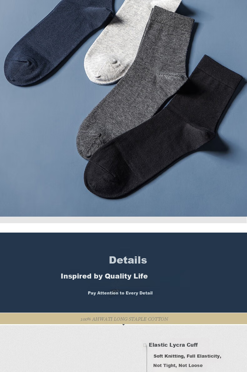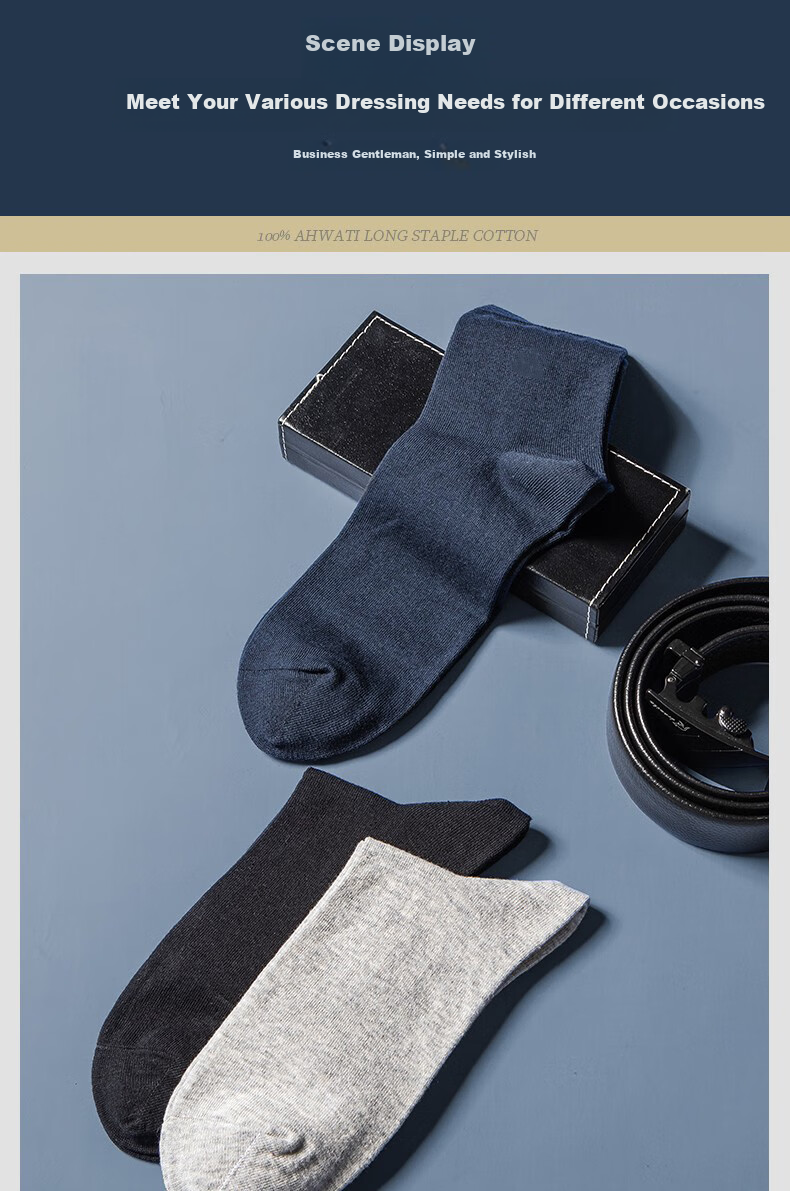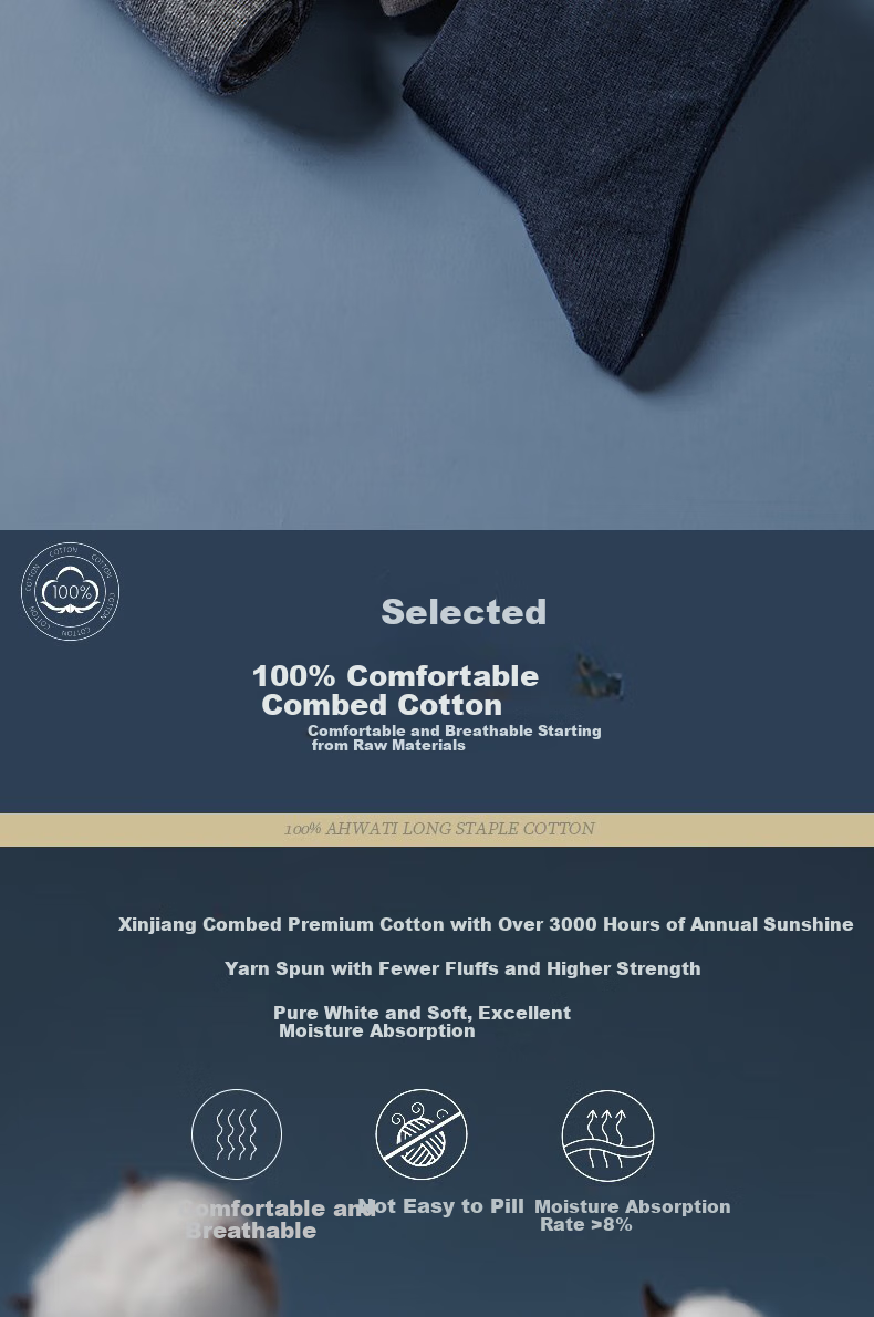**Description:** LangSha Pure Cotton Business Socks are made from 100% AHWATI LONG STAPLE COTTON, providing a comfortable, breathable, and durable wearing experience. The socks are meticulously crafted using 80S long-staple cotton yarn and feature a high antibacterial rate. They are designed to be long-lasting, maintaining their shape and smoothness even after extended wear.