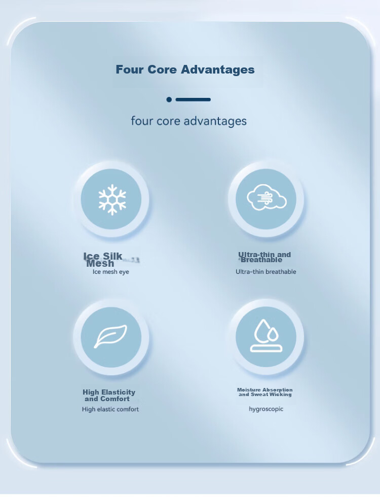 **Advantages:** Ice mesh design, ultra-thin breathable fabric, high elasticity and comfort, moisture-wicking