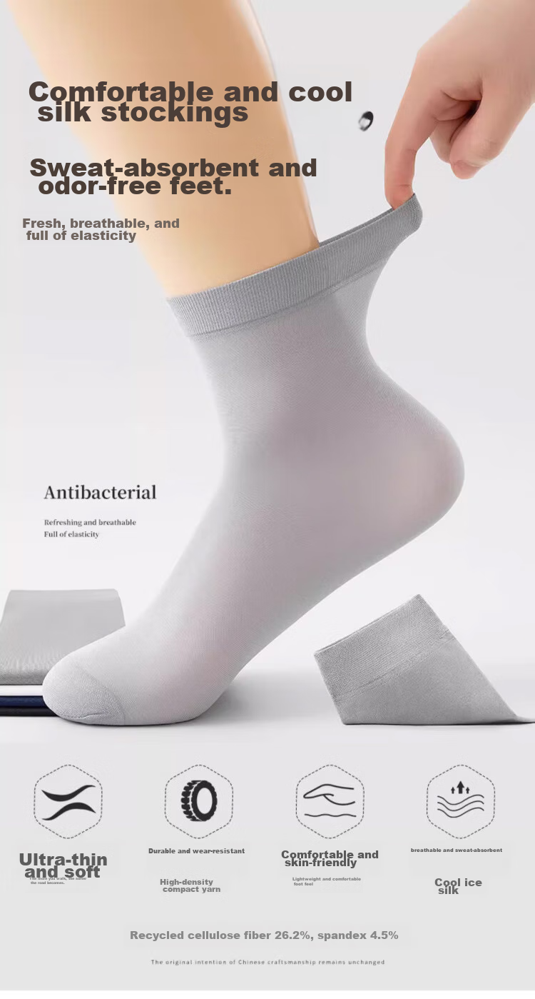 These Ice Silk Men's Socks by LangSha are designed to provide a comfortable, breathable, and antibacterial experience. The high-quality polyester fiber composition ensures durability and elasticity, while the ultra-thin ice silk material offers a cool and refreshing feel. With a focus on craftsmanship and quality, these socks are perfect for everyday wear, keeping your feet dry and comfortable throughout the day.