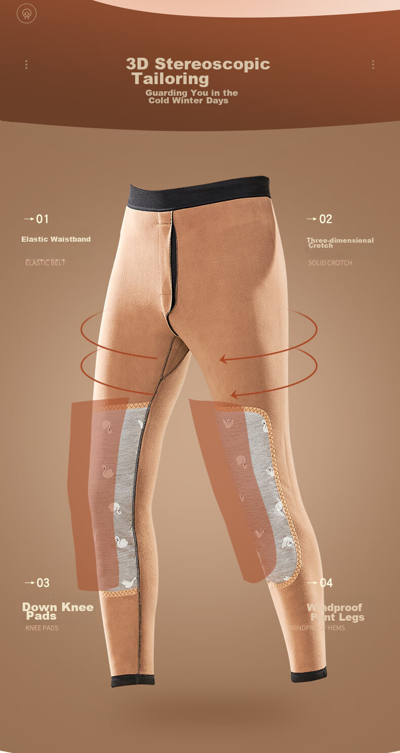 **Comfort:** High down content for professional-grade warmth, Stretchy and snug fit, Elastic spandex for comfort, Buttoned crotch for easy wear