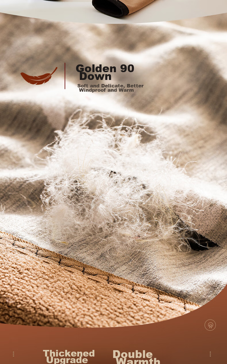 **Insulation:** Golden 90% down, Soft and delicate, Windproof and extra warm, Thickened for enhanced warmth