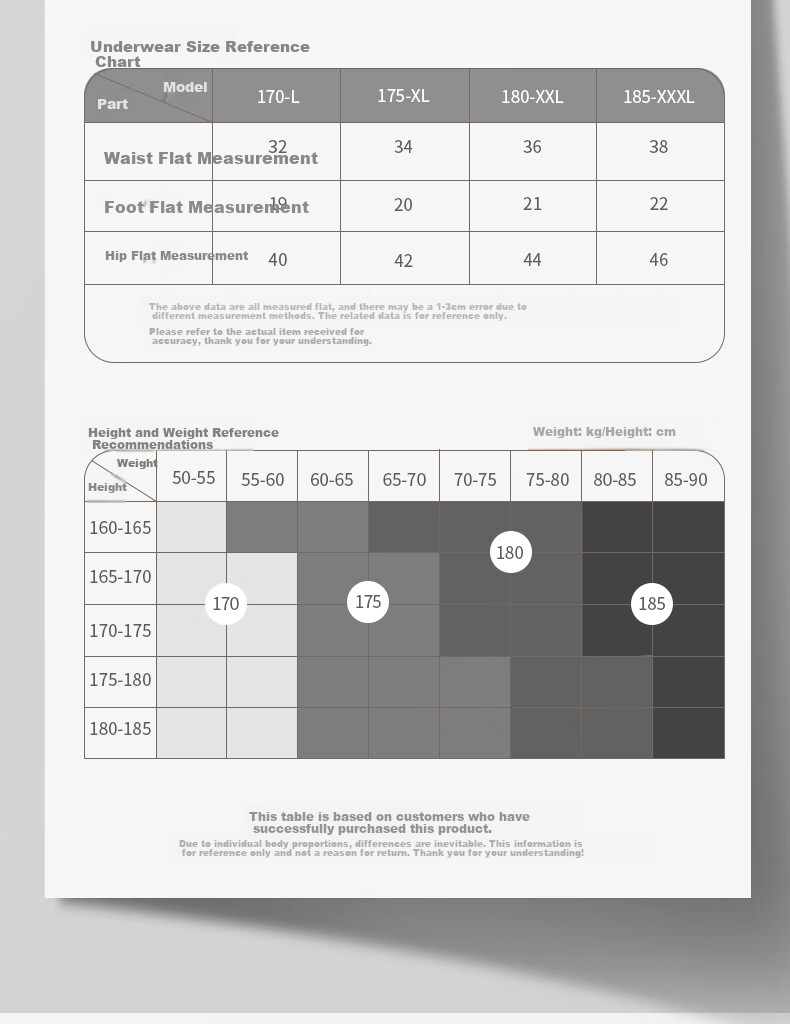**Size Chart:** Waist circumference, leg circumference, hip circumference for sizes 170-L, 175-XL, 180-XXL, 185-XXXL