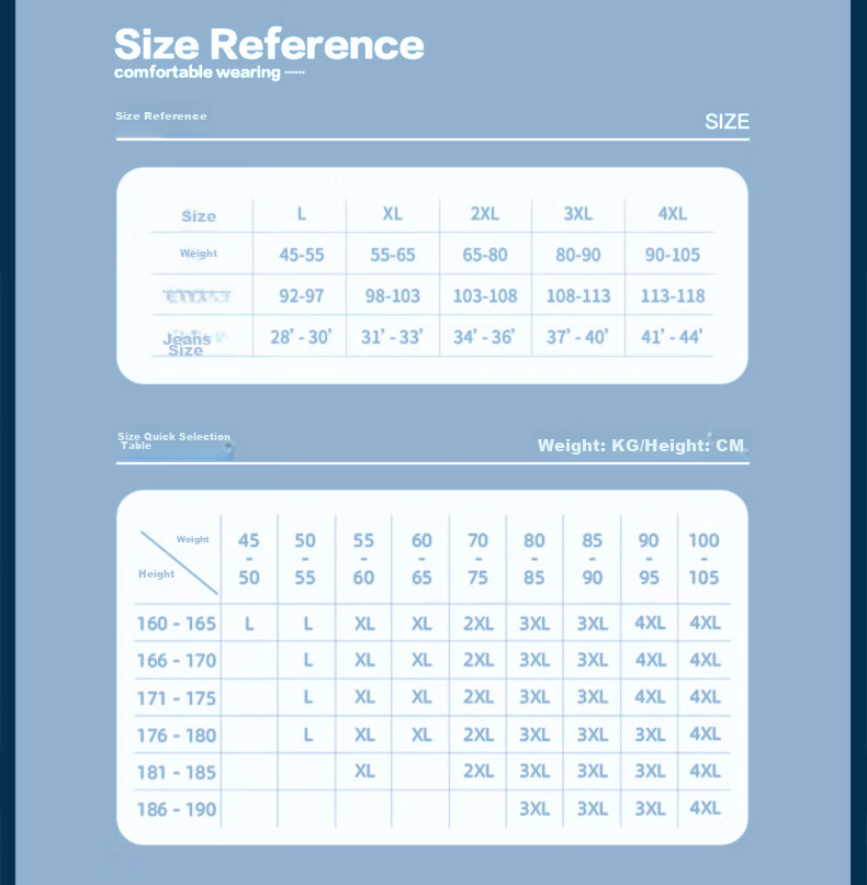 - Jeans size reference: 28'-44'