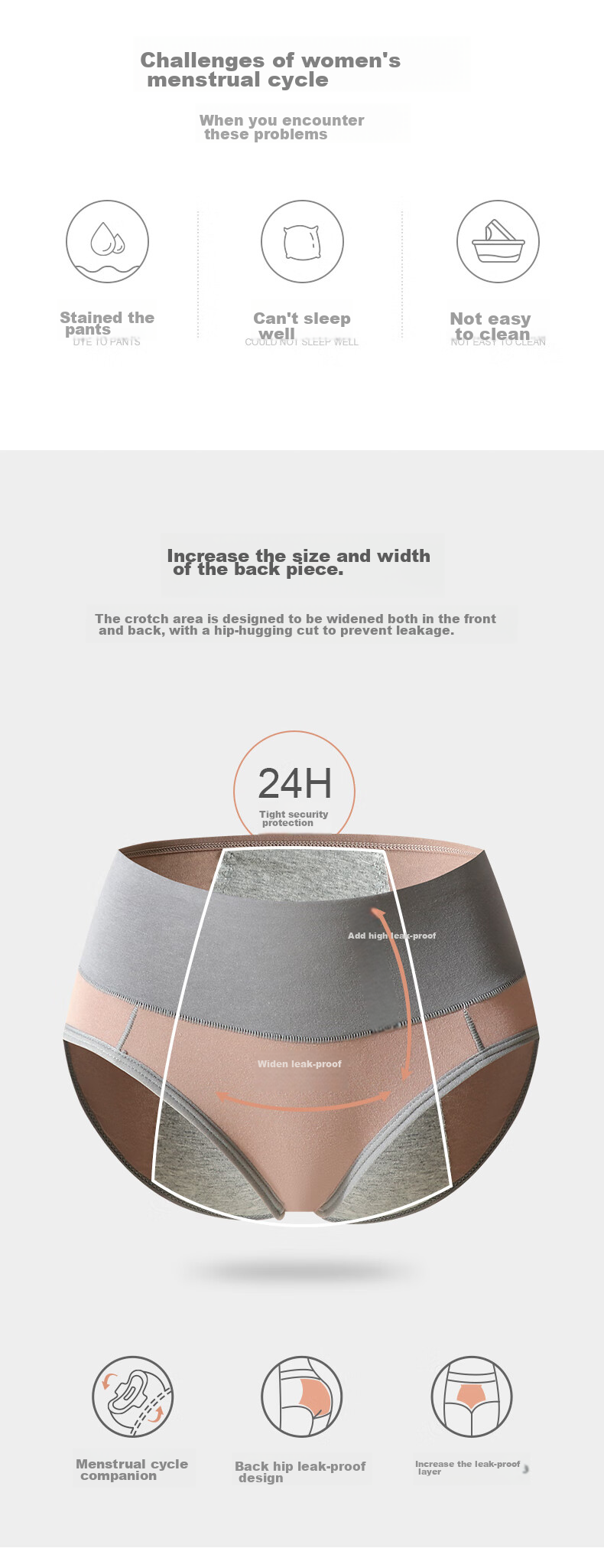 - Enhanced leak-proof design with widened rear and crotch area