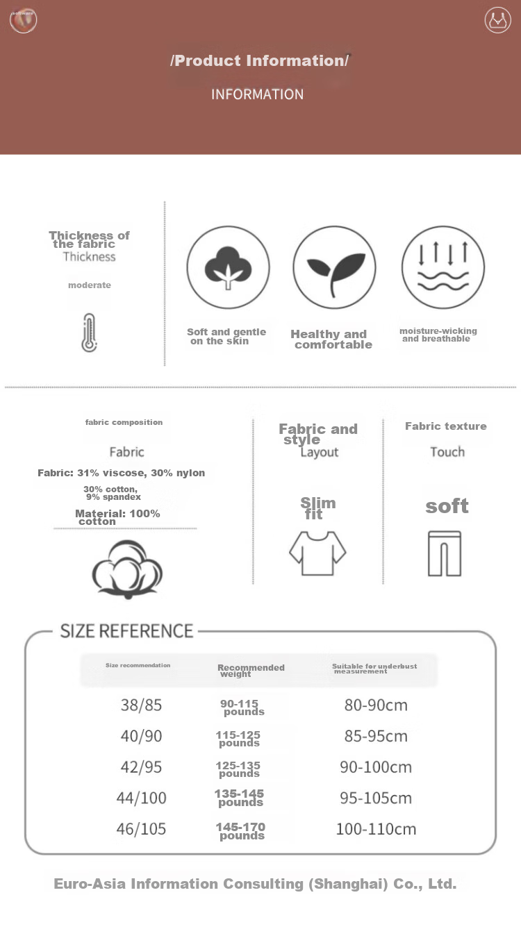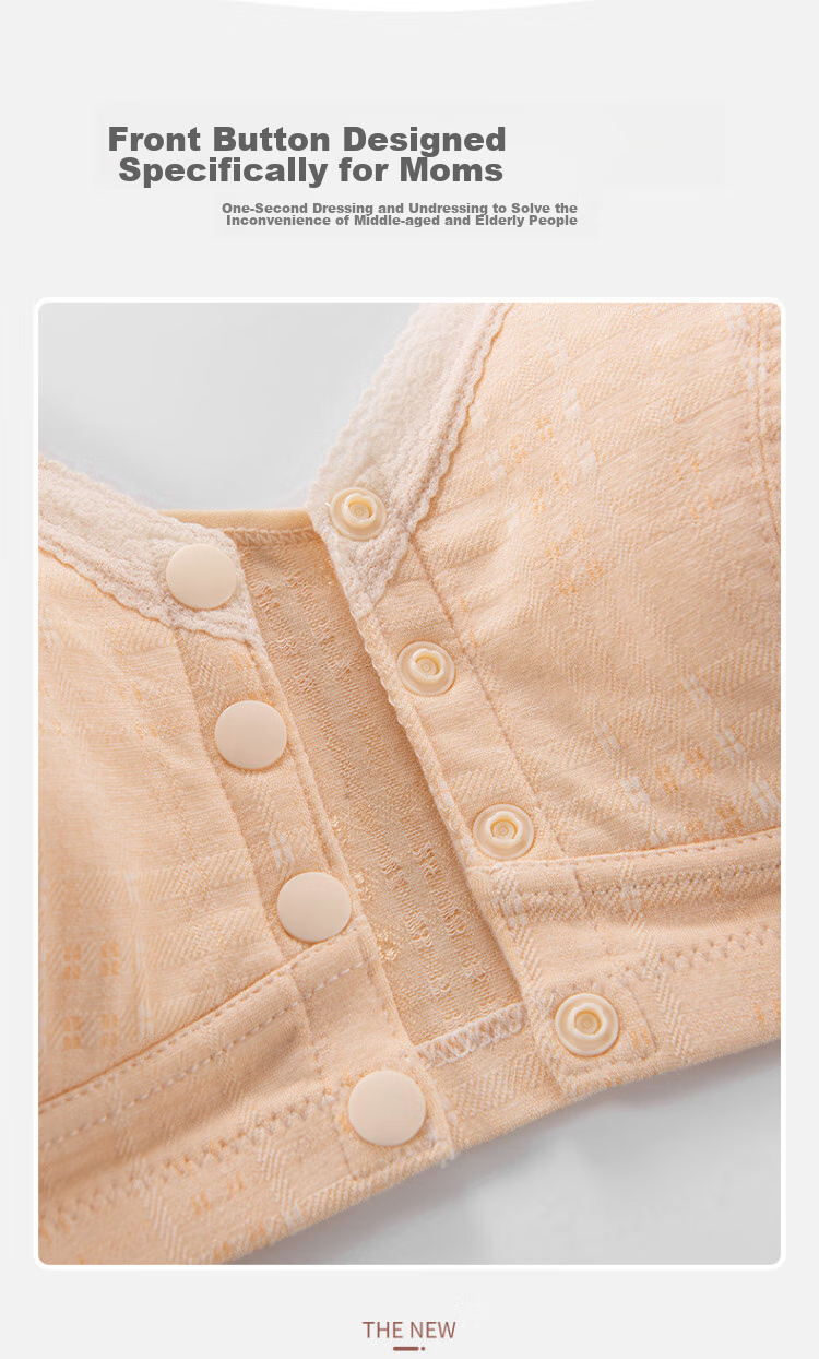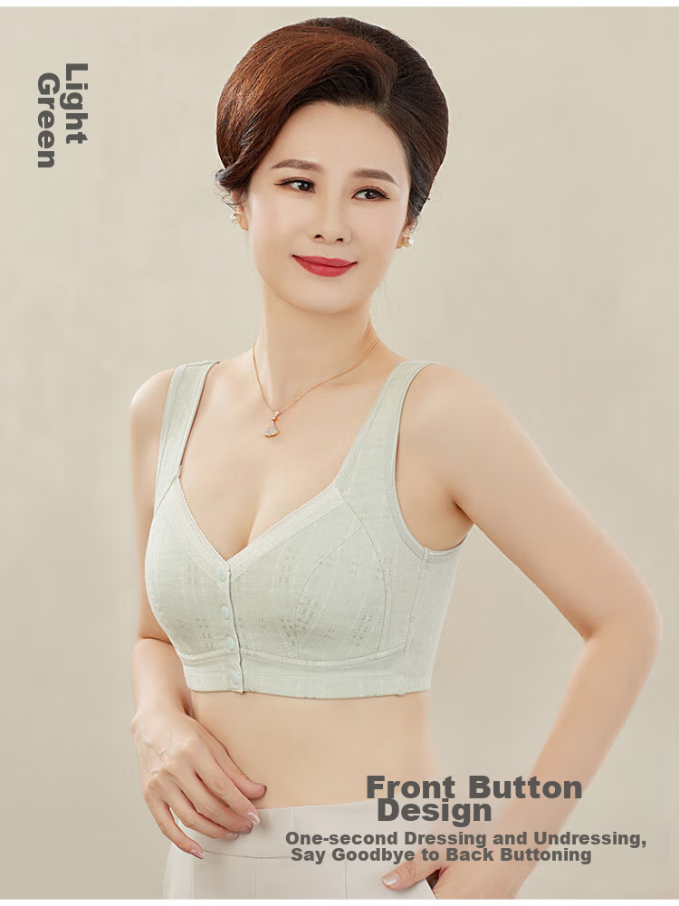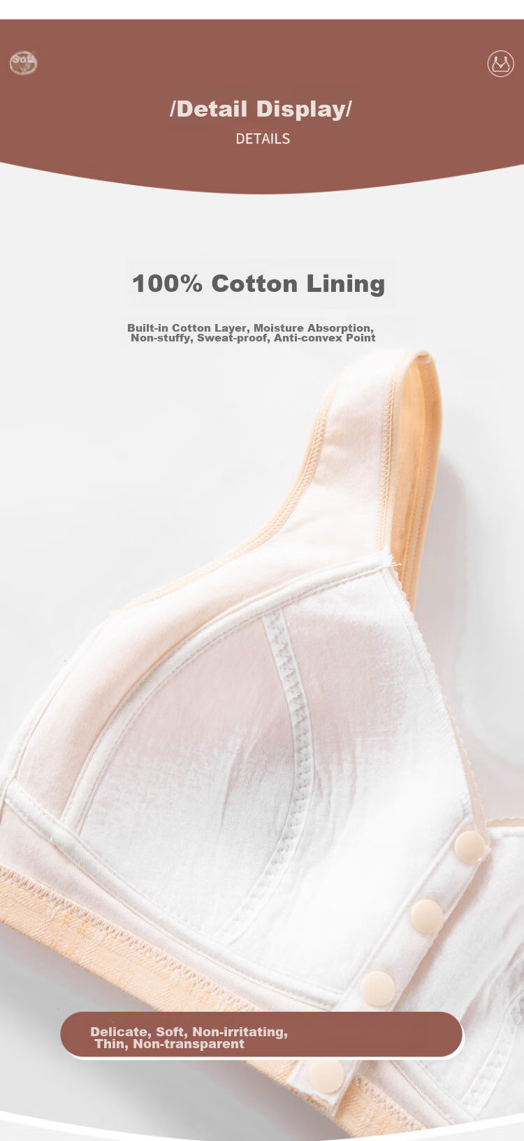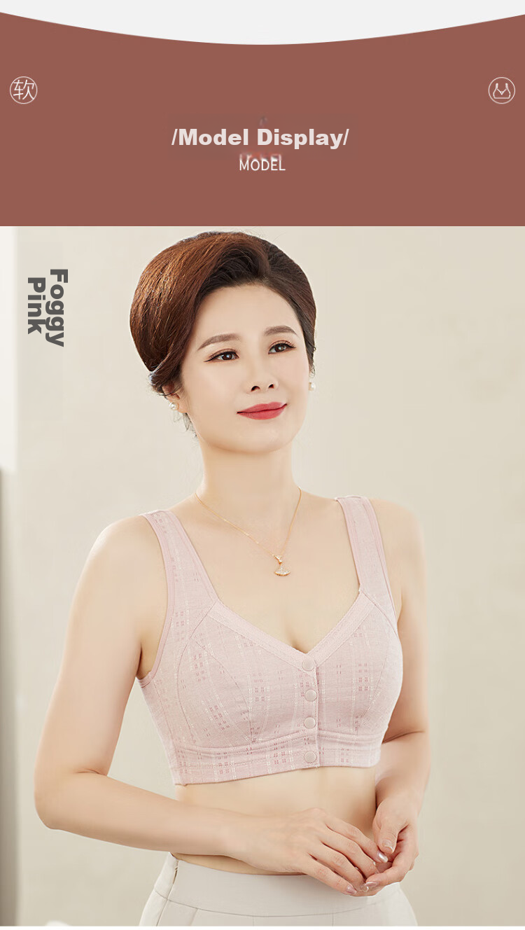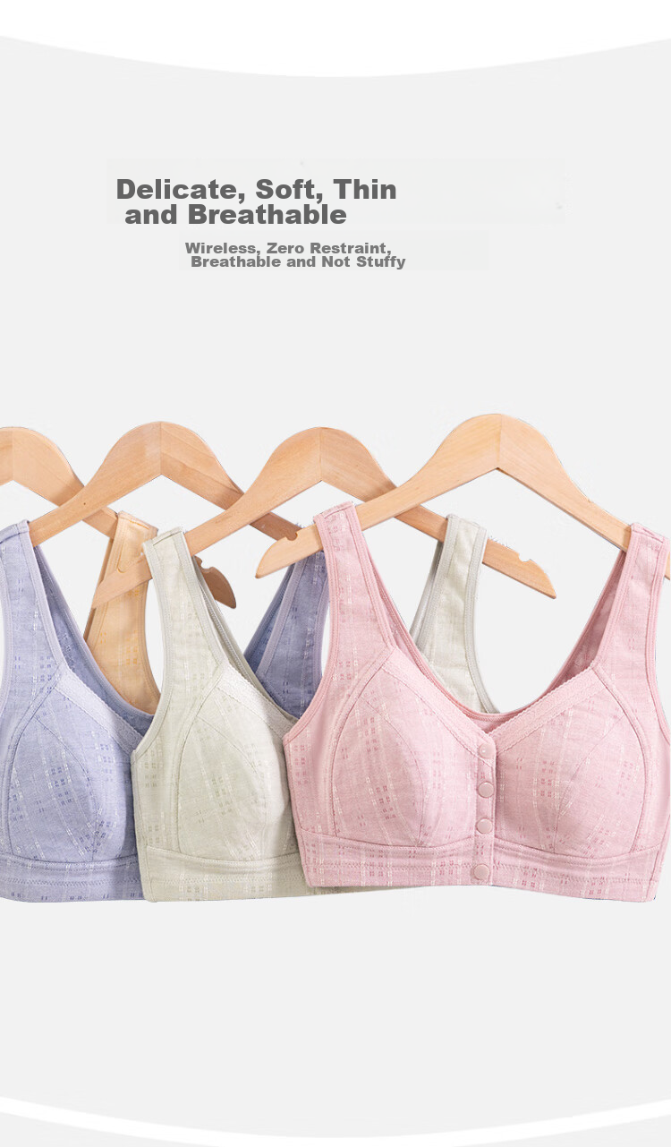 **Description:** This bra provides a comfortable and breathable experience with no steel ring or tightness. It is made of soft and lightweight cotton material that offers side breast support and a secure fit without feeling hot. The bra is designed to wrap and support the chest effectively, preventing cup displacement.
