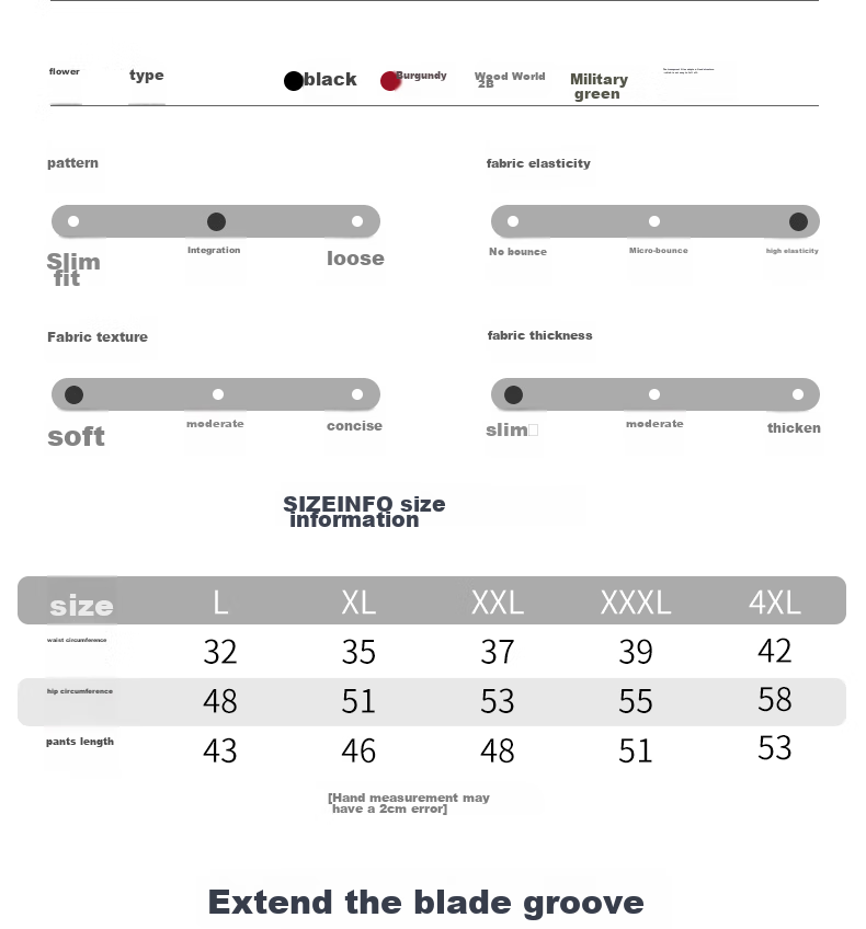 - Waist: 32 (XL), 35 (XXL), 37 (XXXL), 39 (4XL)