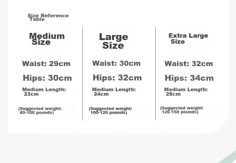 - XL: Waist 32cm, Hip 34cm, Length 25cm (Recommended for 120-150 lbs)