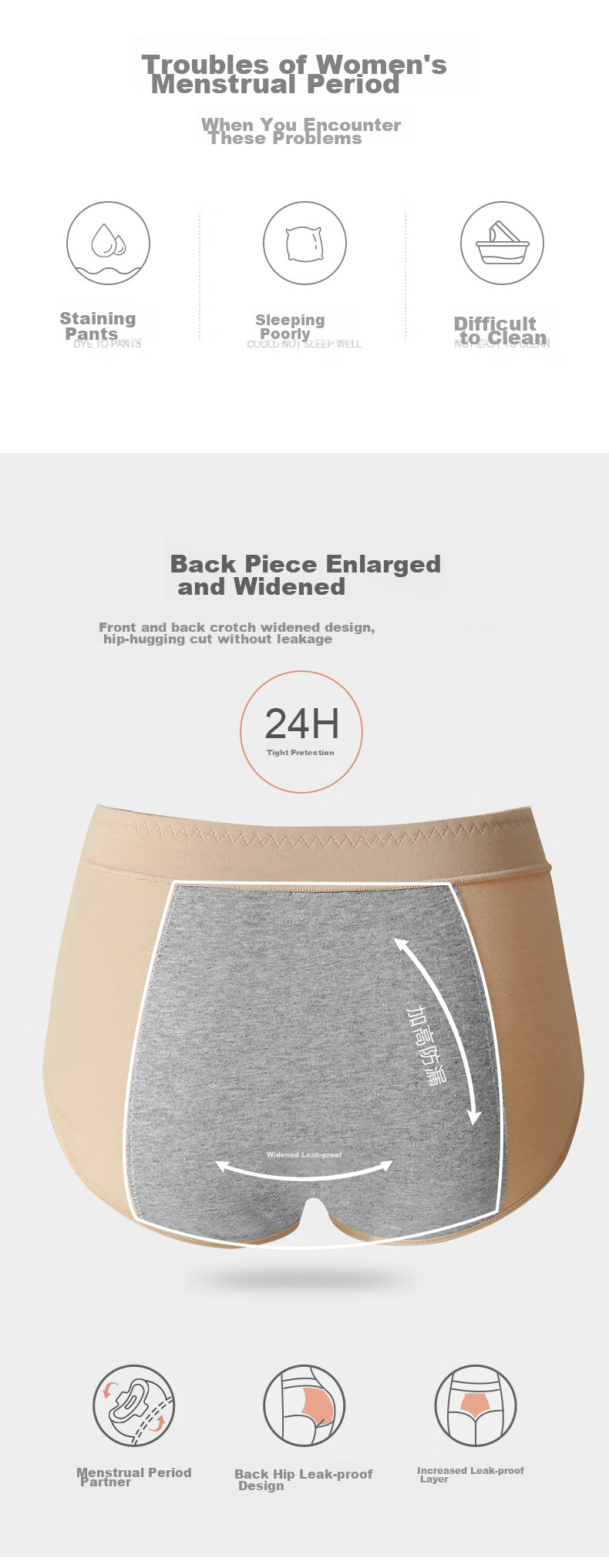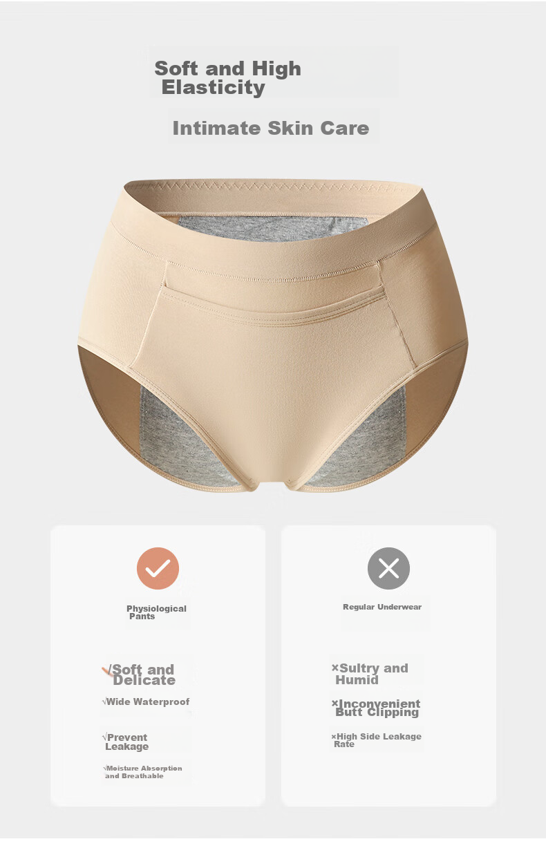 - Enhanced leak-proof design with widened rear and crotch area