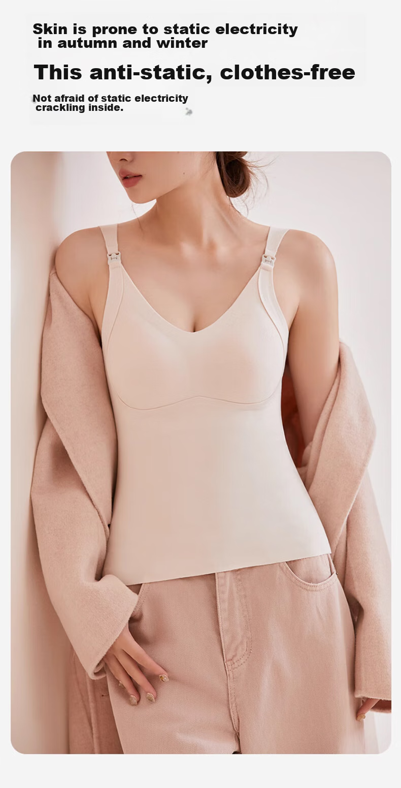 **Description:** This tank top provides warmth and comfort for pregnant and nursing mothers, designed with built-in cup pads to eliminate the need for a cold bra. It is lightweight and suitable for temperatures ranging from 0°C to 20°C, with a locking temperature feature at 37°C for constant warmth. The tank top is made of natural fibers that provide a warm and cozy feeling against the skin, ensuring breathability and moisture-wicking properties. The stretchy fabric accommodates a growing belly during the later stages of pregnancy. The tank top utilizes air insulation technology to create a lasting warmth effect. It is suitable for temperatures from 0°C to 15°C, -5°C to 10°C, and -15°C to 5°C, making it ideal for various outdoor activities in autumn, winter, and deep winter snow conditions.