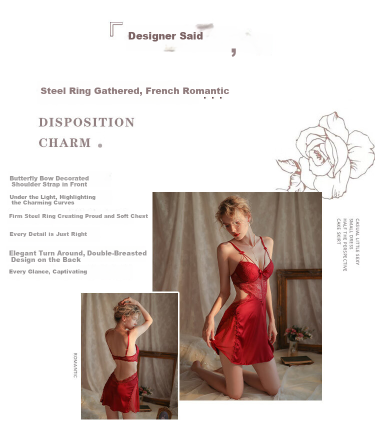 **Designer's Note:** Steel ring gathering, French romance, disposition, charm. Bow decoration on the shoulder straps, highlighting the alluring collarbone under the light. The firm steel ring creates an impressive bust. Every detail is just right. Perspective, elegant turn around. Double-button design on the back, every glance is captivating, romantic.
