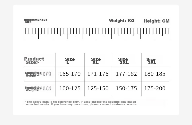 **Recommended Size:** L for height 165-170cm, XL for height 171-176cm, 2XL for height 177-182cm, 3XL for height 180-185cm