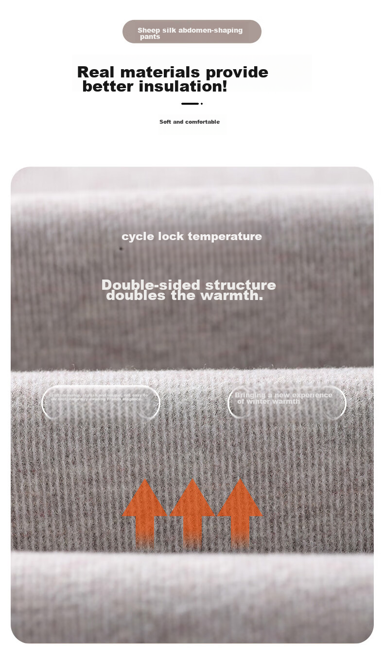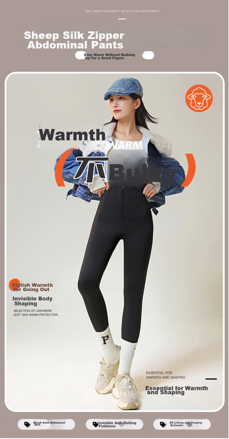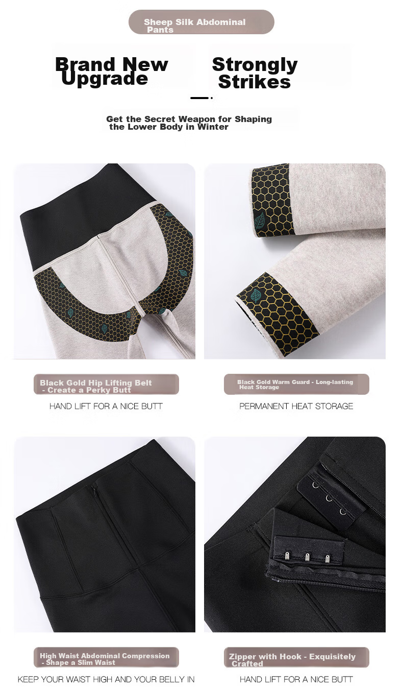 **Description:** LangSha sheep silk zipper abdomen shaping pants, keeping warm without bulkiness for a flattering figure. Featuring IARM technology for warmth and shaping, invisible body shaping, and selection of cashmere for soft and warm protection. The pants come with a black and gold waistband, invisible anti-roll fishbone design, and 5D butt lifting. The upgraded sheep silk abdomen shaping pants are the secret weapon for shaping the lower body in winter, featuring a black and gold butt lifting belt for a lifted butt and long-lasting warmth.