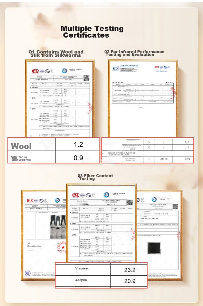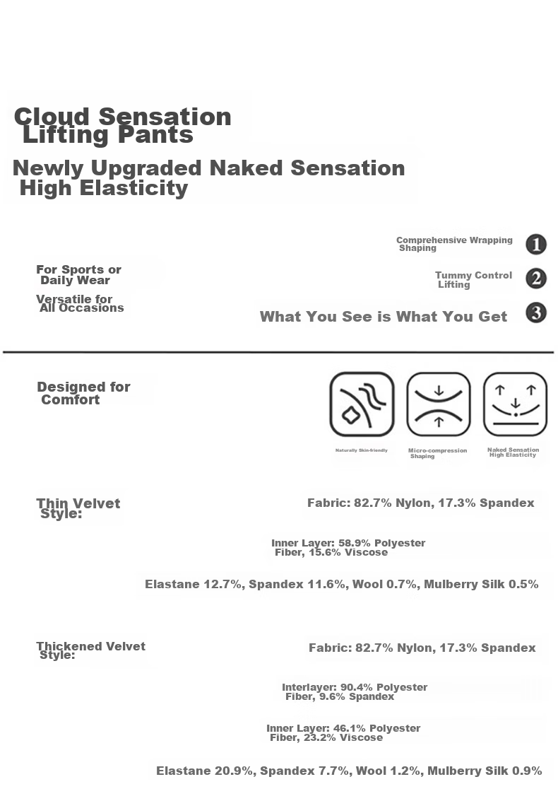 - Thick version: Nylon 82.7%, Spandex 17.3%; Middle layer: Polyester 90.4%, Spandex 9.6%; Inner layer: Polyester 46.1%, Viscose 23.2%, Spandex 20.9%, Ammonia 7.7%, Sheep wool 1.2%, Mulberry silk 0.9%