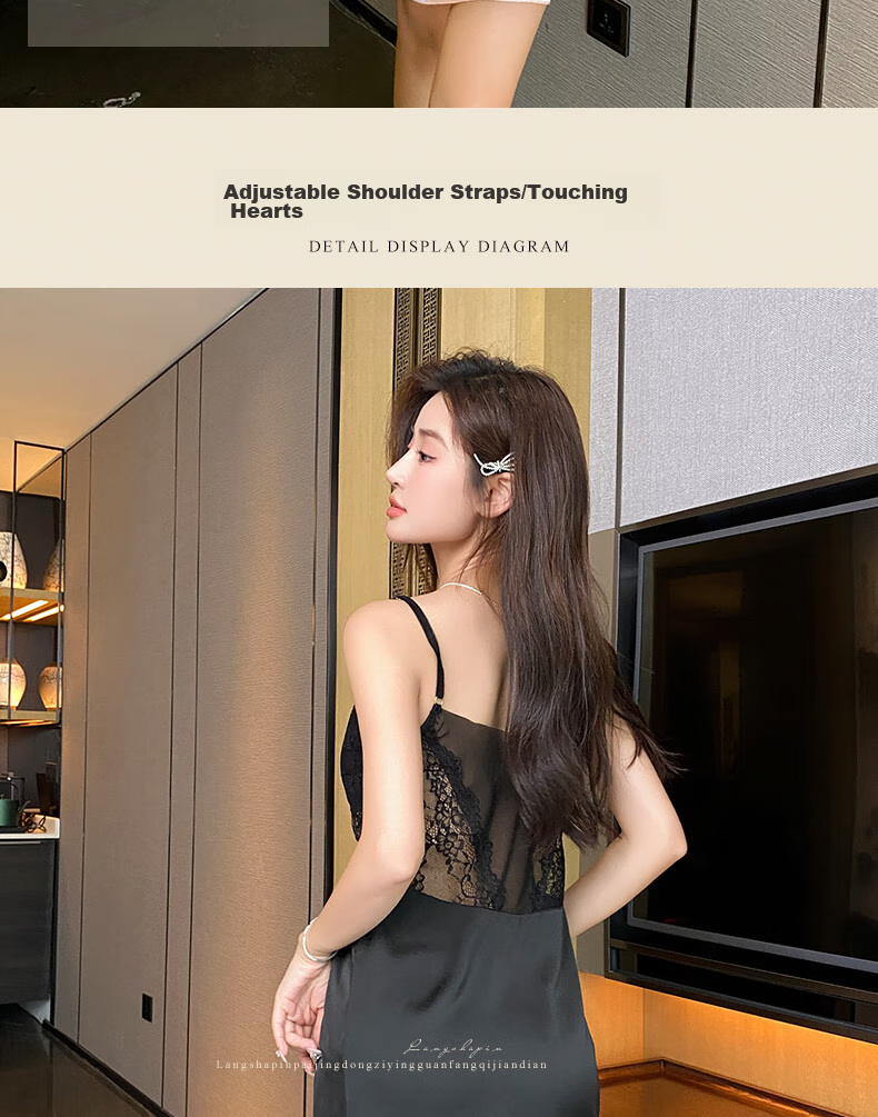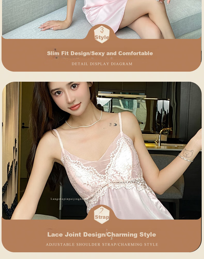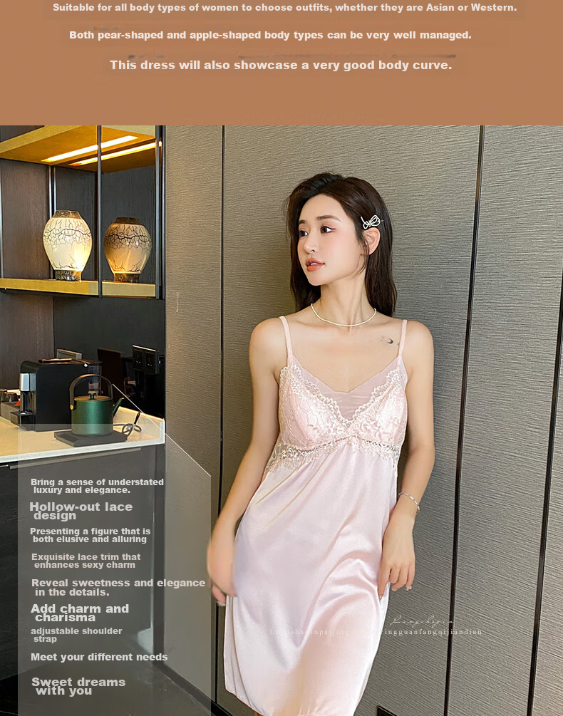 - The LangSha PURE WIND SLEEPING DRESS is designed to enhance your curves and provide a luxurious feel. With its lace and satin details, this dress exudes elegance and charm. Adjustable shoulder straps and a V-neck design add a touch of allure, making it a perfect choice for a dreamy night.