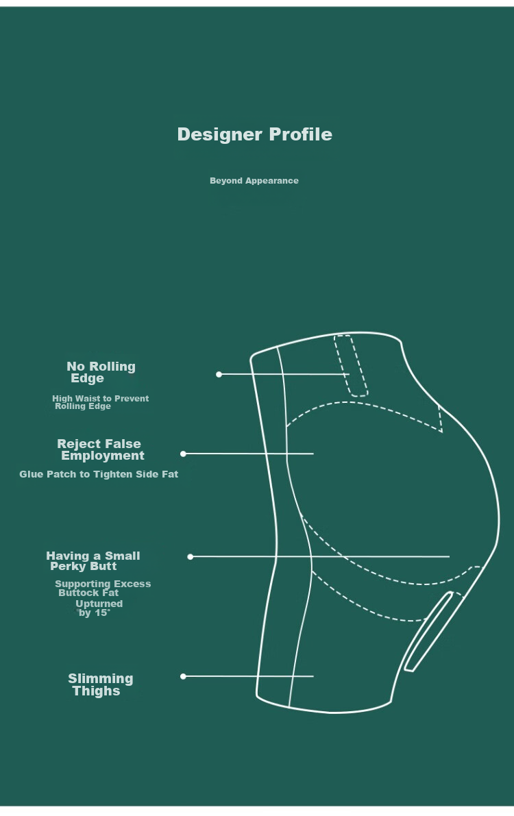 **Designer Profile:** High-waisted design to prevent rolling, adhesive patches to tighten side fat, lift buttocks by 15 degrees, shaping thighs