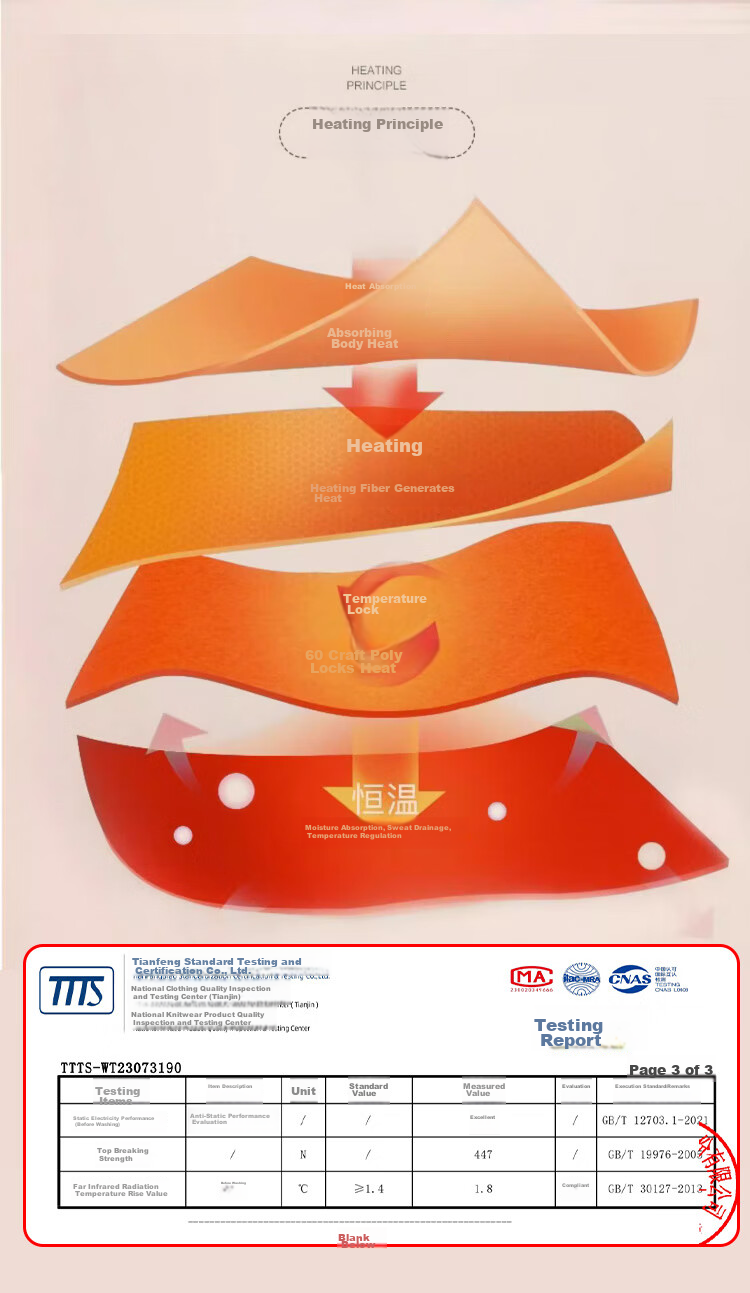 **Testing Report:** TTTS-WT23073190, 3 pages, including static electricity performance, breaking strength, far infrared radiation temperature rise value, etc.