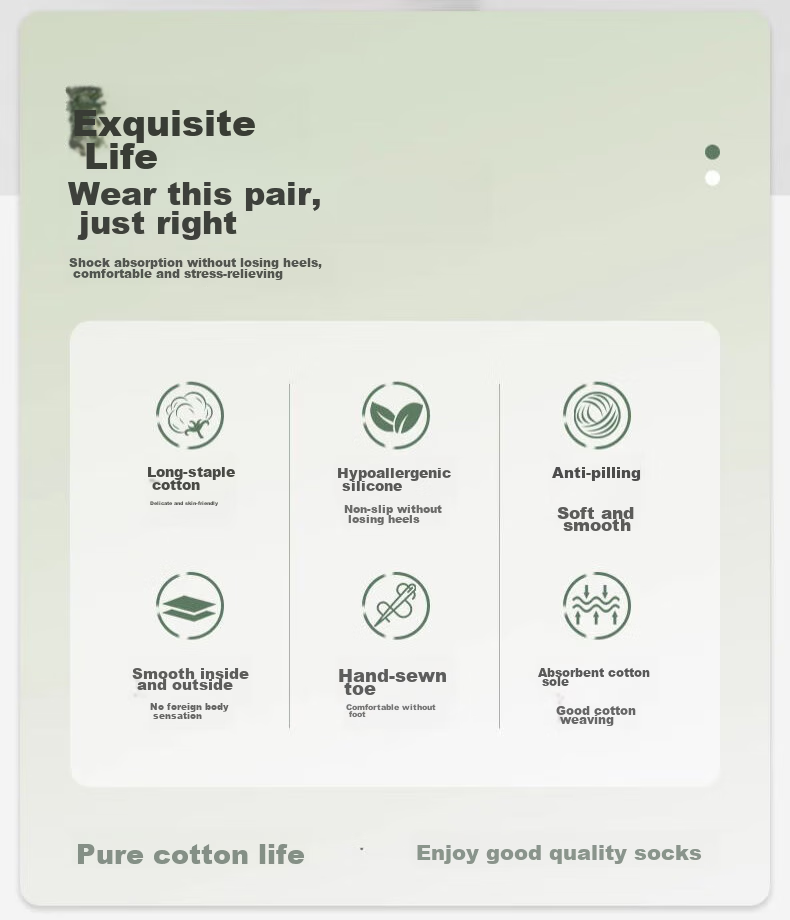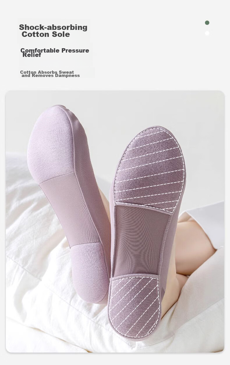 **Additional Details:** Sponge sole for shock absorption, moisture-wicking towel sole, high-density weaving for wrinkle resistance, reinforced heel with silicone grip, plant-based dye for colorfastness and skin-friendly properties