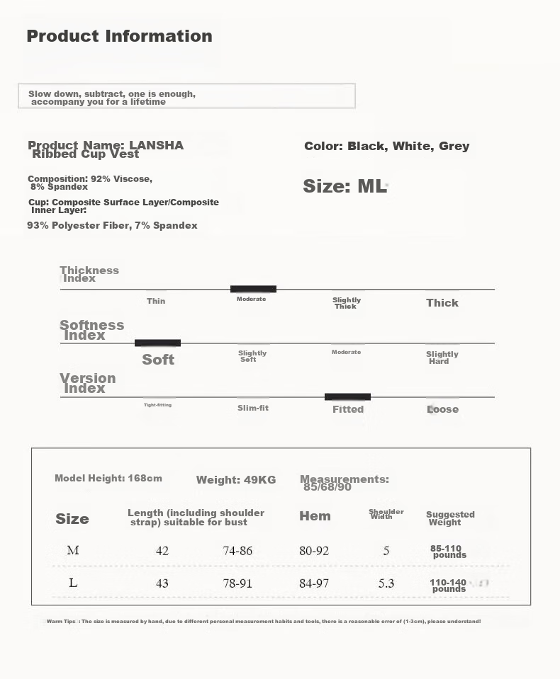 - **L:** Length (including shoulder strap) 43cm, Bust 78-91cm, Hem 84-97cm, Shoulder Width 5.3cm, Recommended Weight 110-140lbs