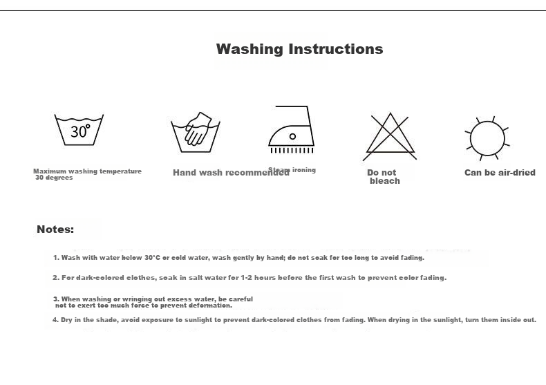 - Tips: Gentle wash with water below 30°C, soak for a short time, avoid fading; soak dark clothes in saltwater for 1-2 hours before first wash to prevent color loss; avoid excessive force when washing or wringing to prevent deformation; dry in shade to prevent color fading, when drying in sunlight, turn inside out