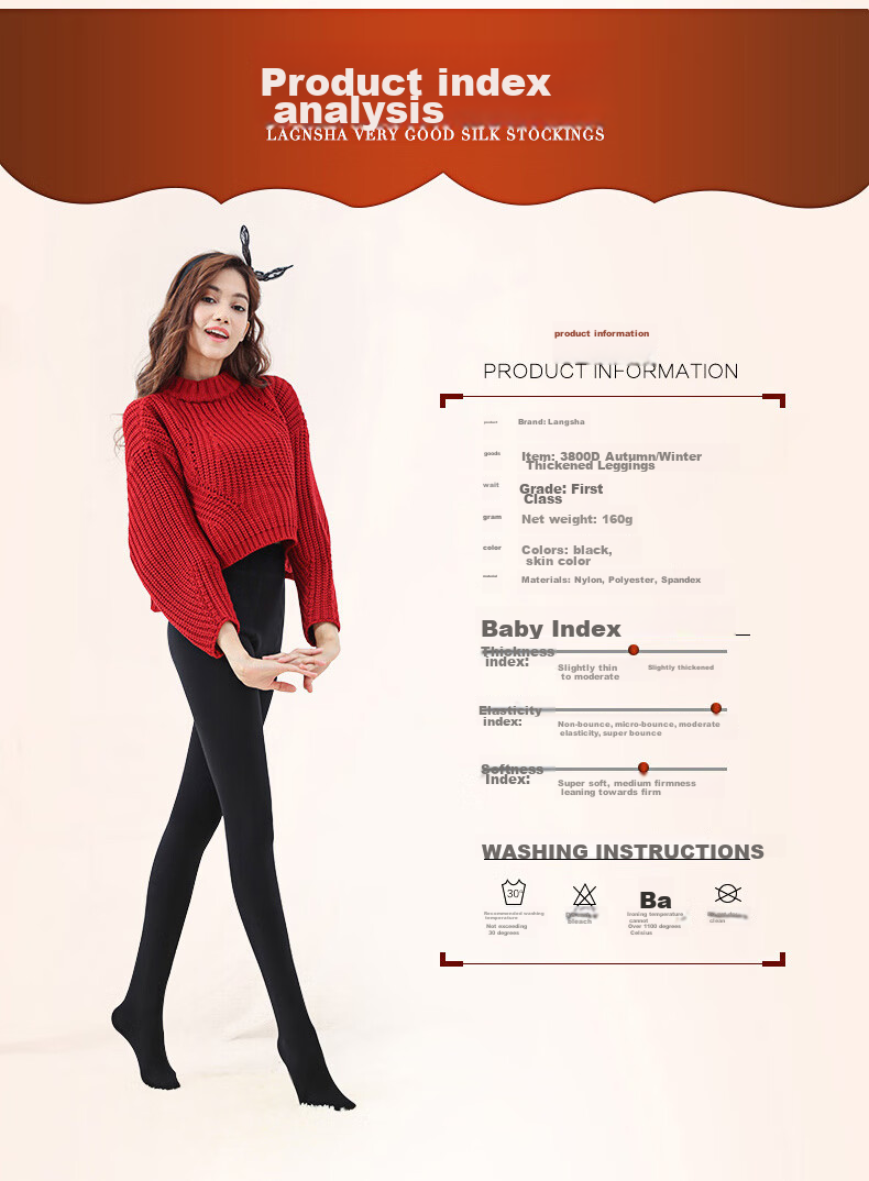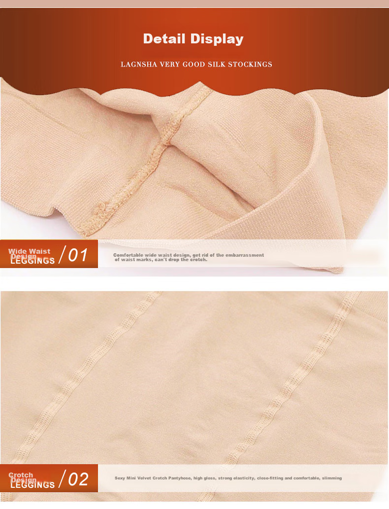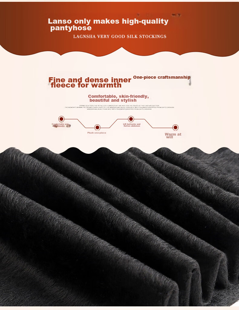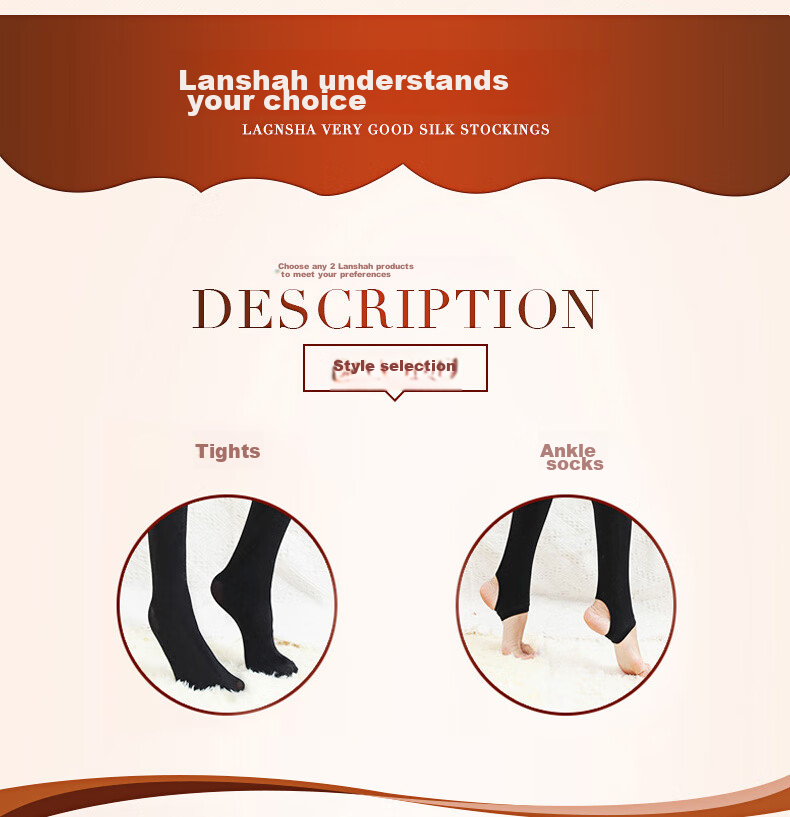 **Description:** LangSha understands your preferences with LAGNSHA VERY GOOD SILK STOCKINGS. Choose from 2 styles to match your taste - footed tights or leggings. Embrace fashion and beauty with LangSha's stylish and comfortable legwear. These leggings are designed to provide warmth and comfort, with options for different thicknesses based on personal preference. The LangSha SKIL leggings offer a comfortable sensory experience with high elasticity, breathability, and softness. The high elastic self-cultivation design enhances the shape of your legs, while the fleece-lined upgrade provides extra warmth without adding bulk. The leggings are made with a blend of nylon and spandex for a smooth and stretchy feel. LangSha promises quality and authenticity, ensuring a secure shopping experience.