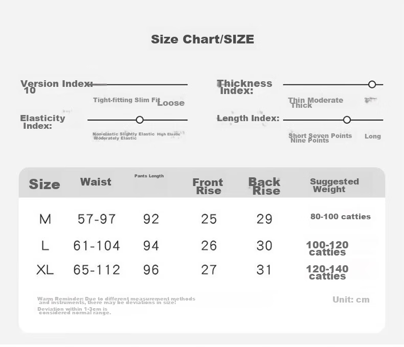 - **M:** Waist 57-97cm, Length 92cm, Front Rise 25cm, Back Rise 29cm, Recommended Weight 80-100 lbs