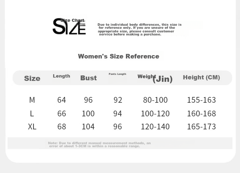 - *M:* Length 64cm, Bust 96cm, Pants Length 92cm, Weight 80-100kg, Height 155-163cm