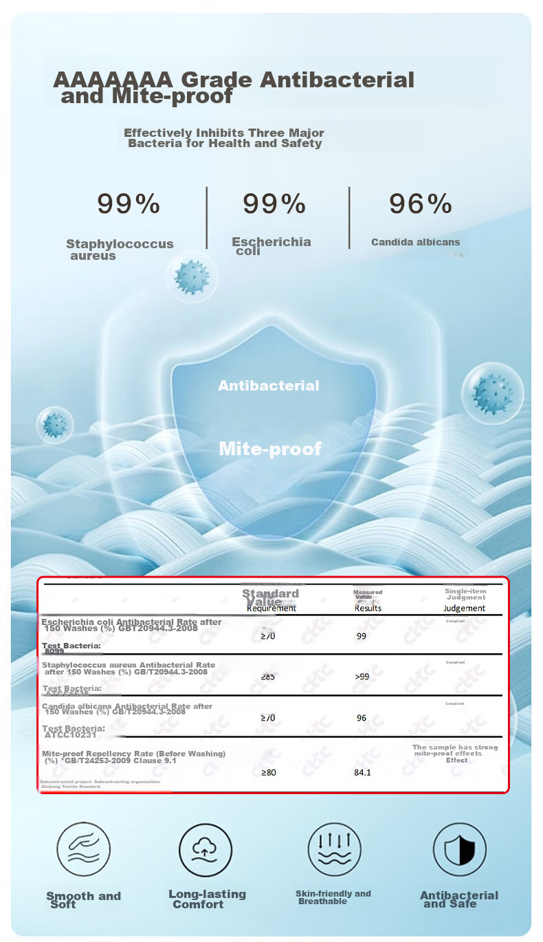 AAAAAAA grade antibacterial and mite-proof, effectively inhibiting three major bacteria: 99% Staphylococcus aureus, 99% Escherichia coli, 96% Candida albicans