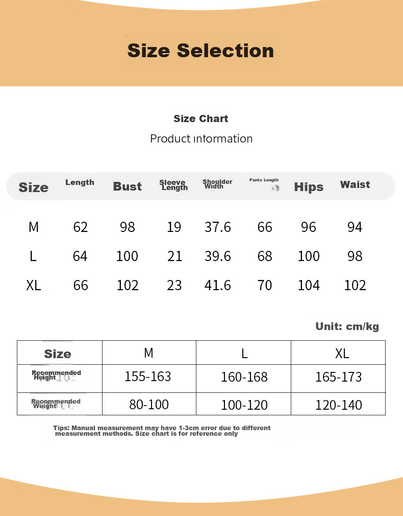 - M: Length 62cm, Bust 98cm, Sleeve Length 19cm, Shoulder Width 37.6cm, Pants Length 66cm, Hip 96cm, Waist 94cm