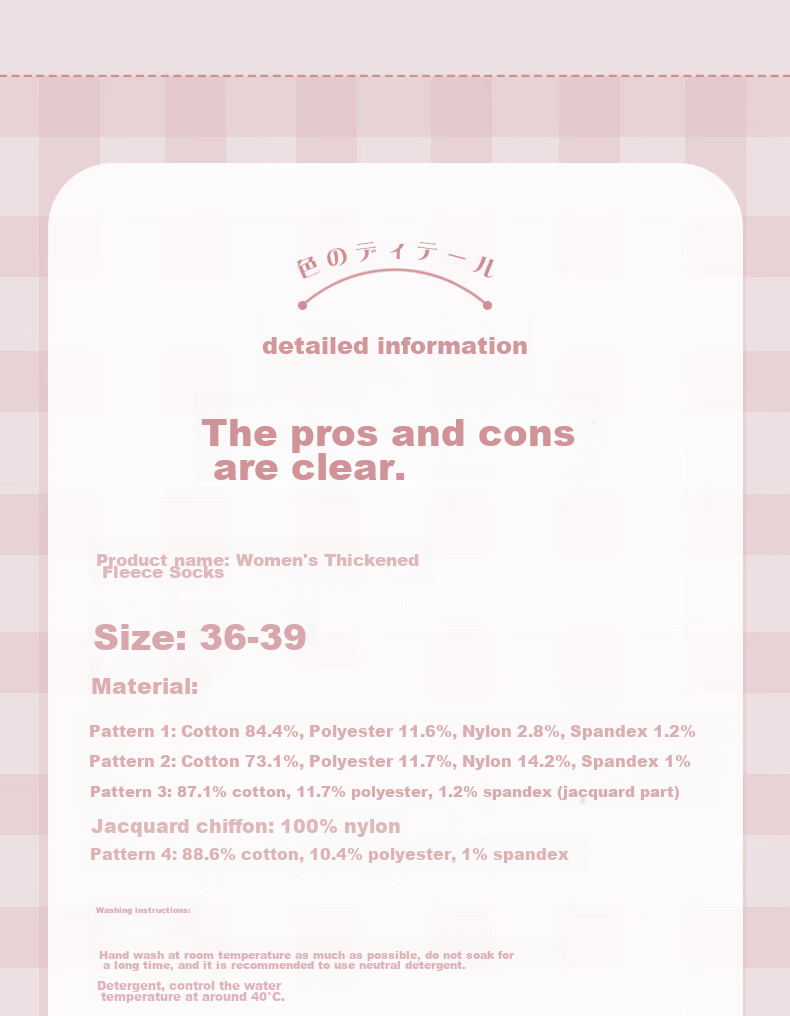 - **Care Instructions:** Hand wash in lukewarm water, do not soak for a long time. Use neutral detergent. Water temperature should be around 40°C.