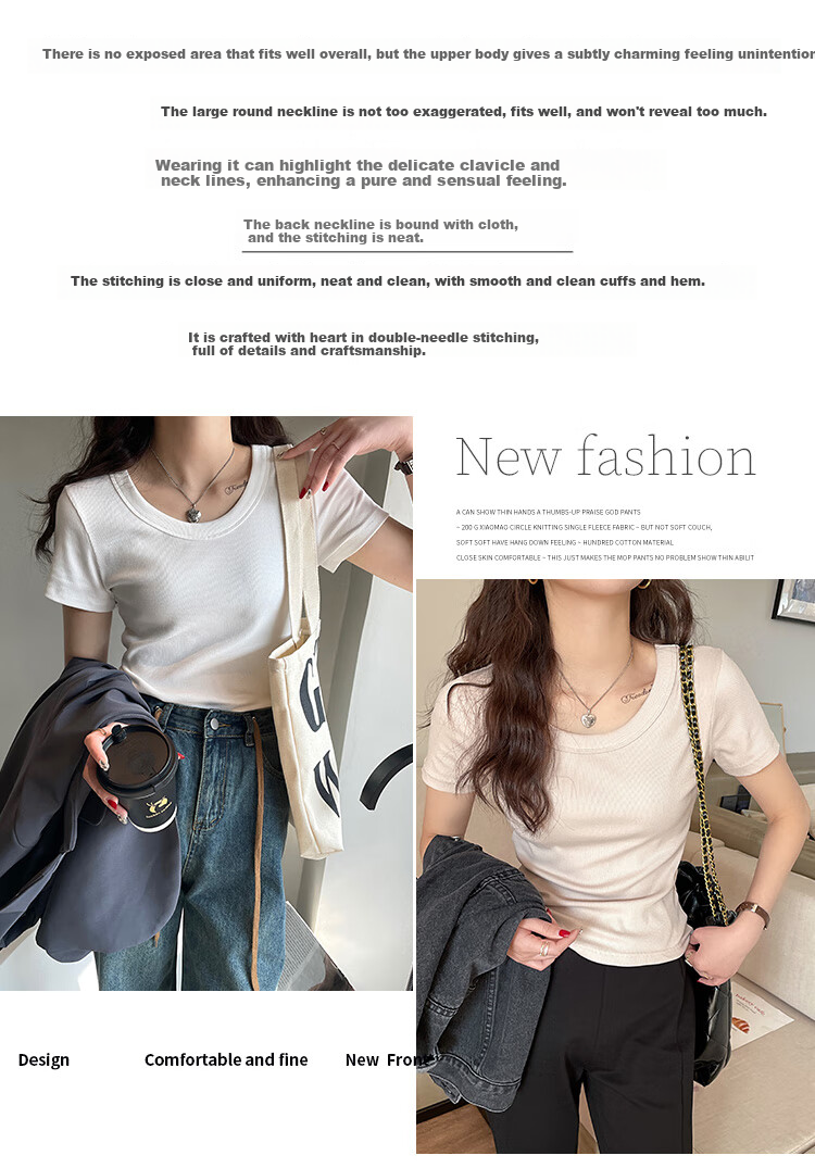 **Design:** The T-shirt fits well without revealing too much, giving a subtly attractive look. The large round neckline is not exaggerated, ensuring a good fit without being too revealing. The back neckline is neatly finished with precise stitching, giving a clean and polished look. The cuffs and hem are crafted with double-needle stitching for a detailed finish.