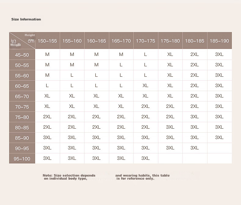 (Note: Size selection may vary based on individual body type and wearing habits. This table is for reference only.)