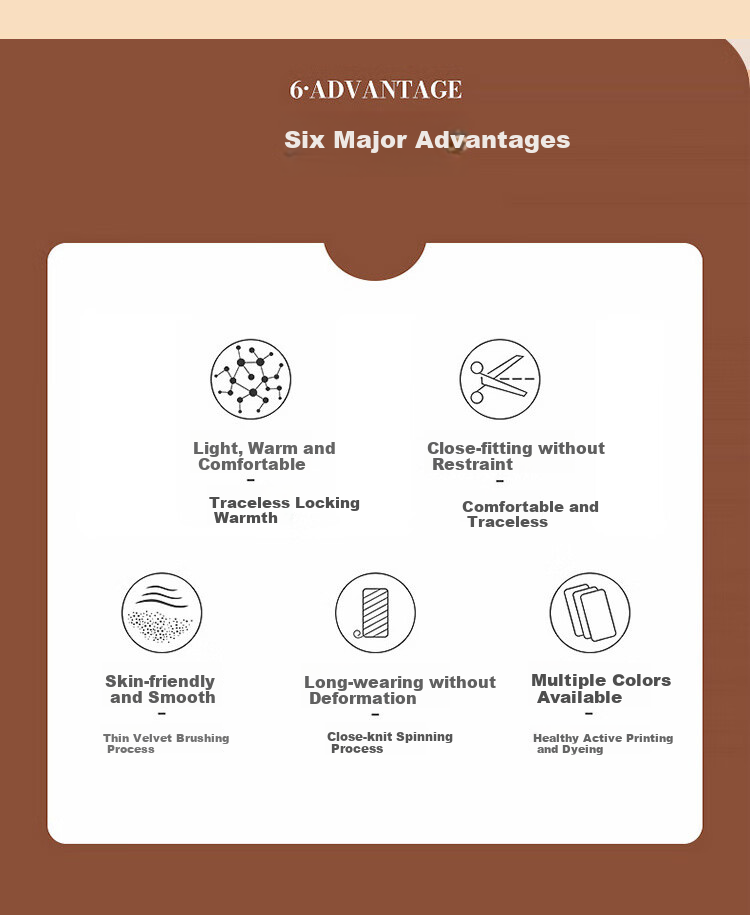 - 6·ADVANTAGE: Six major advantages including lightweight, warm, comfortable, seamless fit, no trace of warmth locking, smooth and skin-friendly, long-lasting shape retention, available in multiple colors.