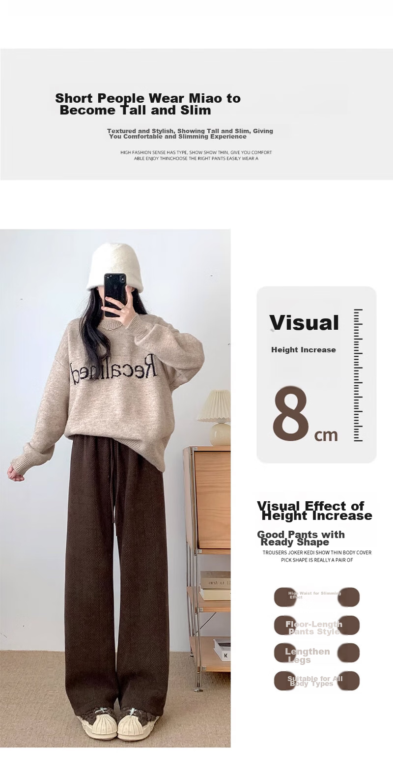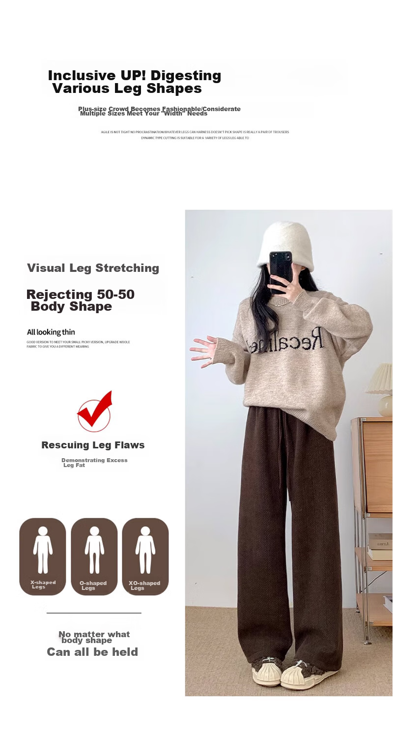**Clothes Introduction:** This product is designed to make you look slim, tall, comfortable, breathable, and effectively cover any imperfections. It features a dynamic type cutting suitable for various leg shapes, providing a flattering fit for all body types. The knit wide-leg pants are a timeless fashion piece that adds vitality to any outfit. They are versatile, flattering, and comfortable, suitable for different seasons and occasions.