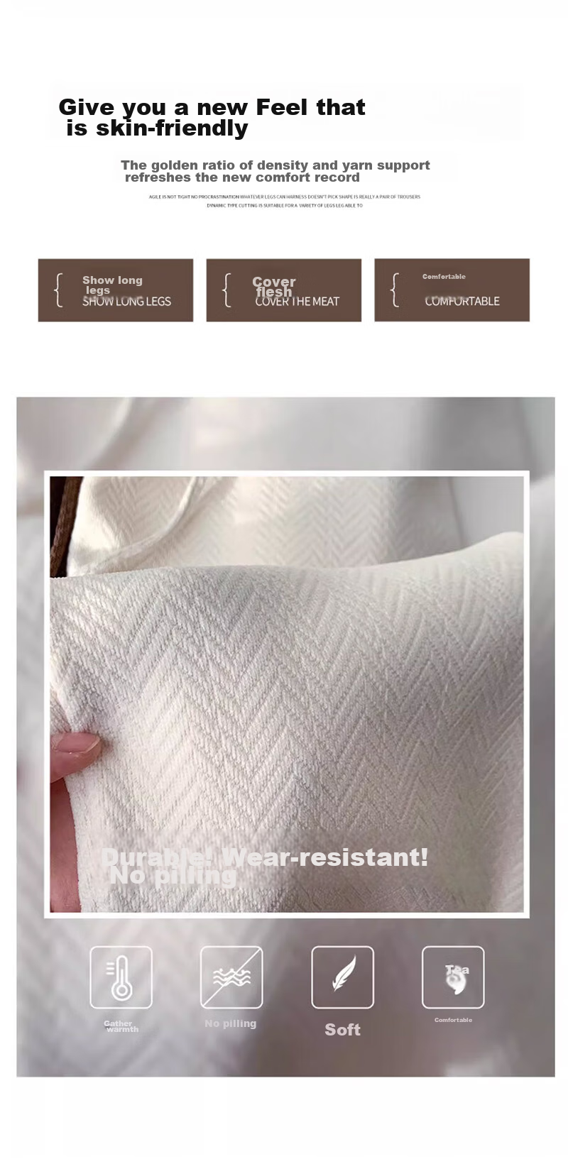 **Design Highlights:** The pants are designed to create a "supermodel legs" effect, with a focus on comfort, durability, and style. The fabric is soft, comfortable, and resistant to pilling. The pants come in two different thickness options for different temperatures and are available in various colors to suit different preferences.