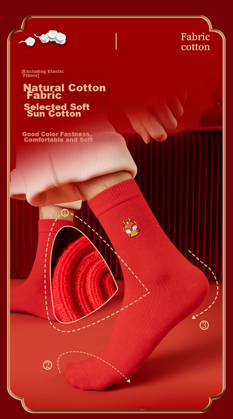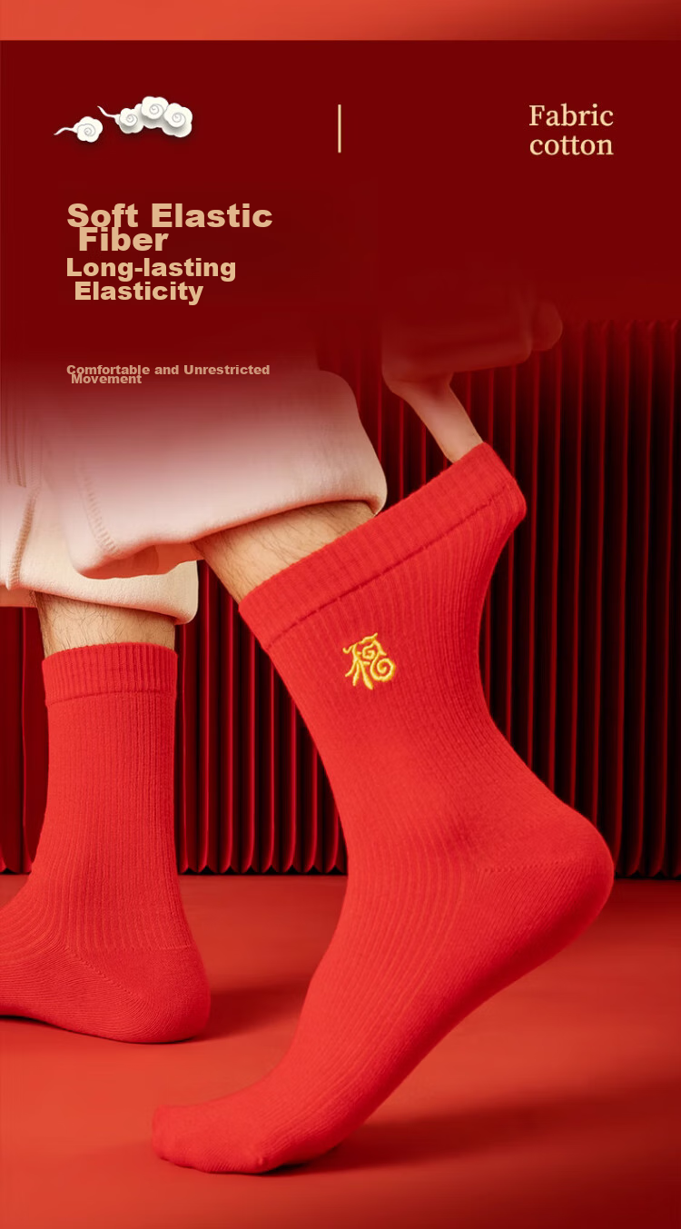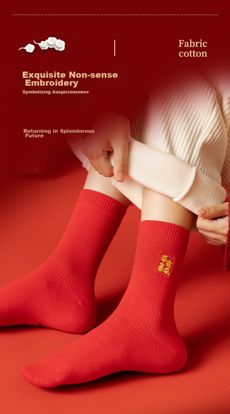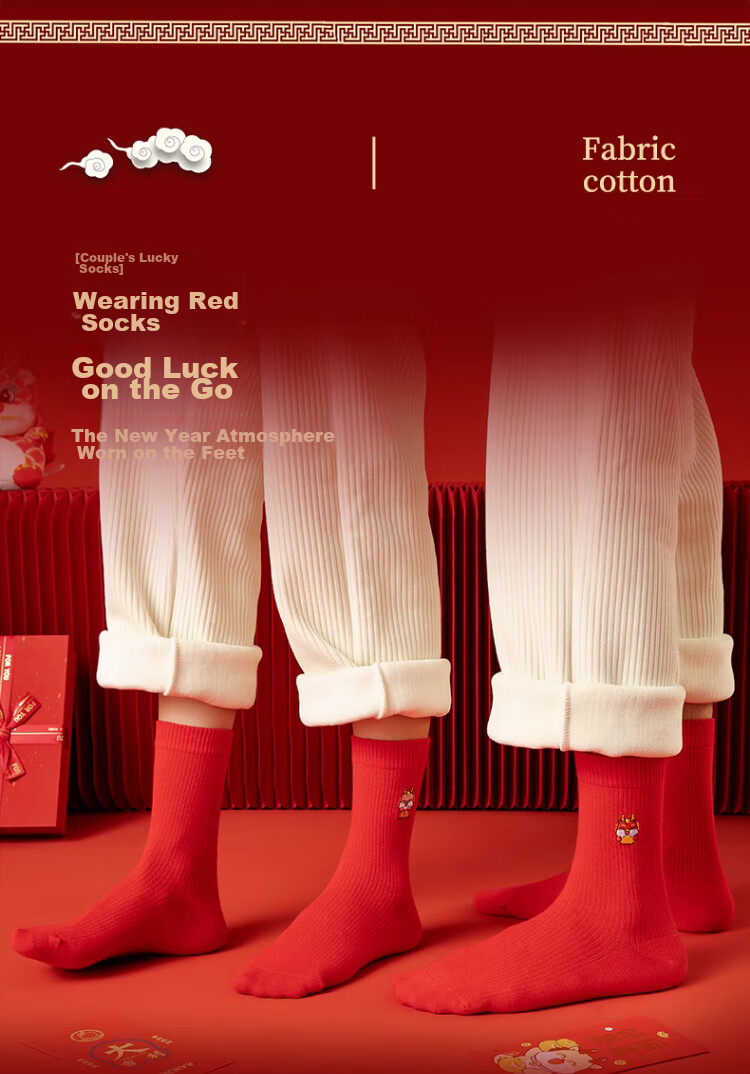 These LangSha Good Luck Series couple socks are made of high-quality cotton fabric, featuring intricate embroidery and a comfortable fit. The design includes double needle construction for breathability and moisture control, ensuring a dry and cozy feel. The socks are antibacterial, anti-pilling, and have a symbolic red color representing good fortune. Perfect for ushering in the Chinese New Year with style and auspiciousness.