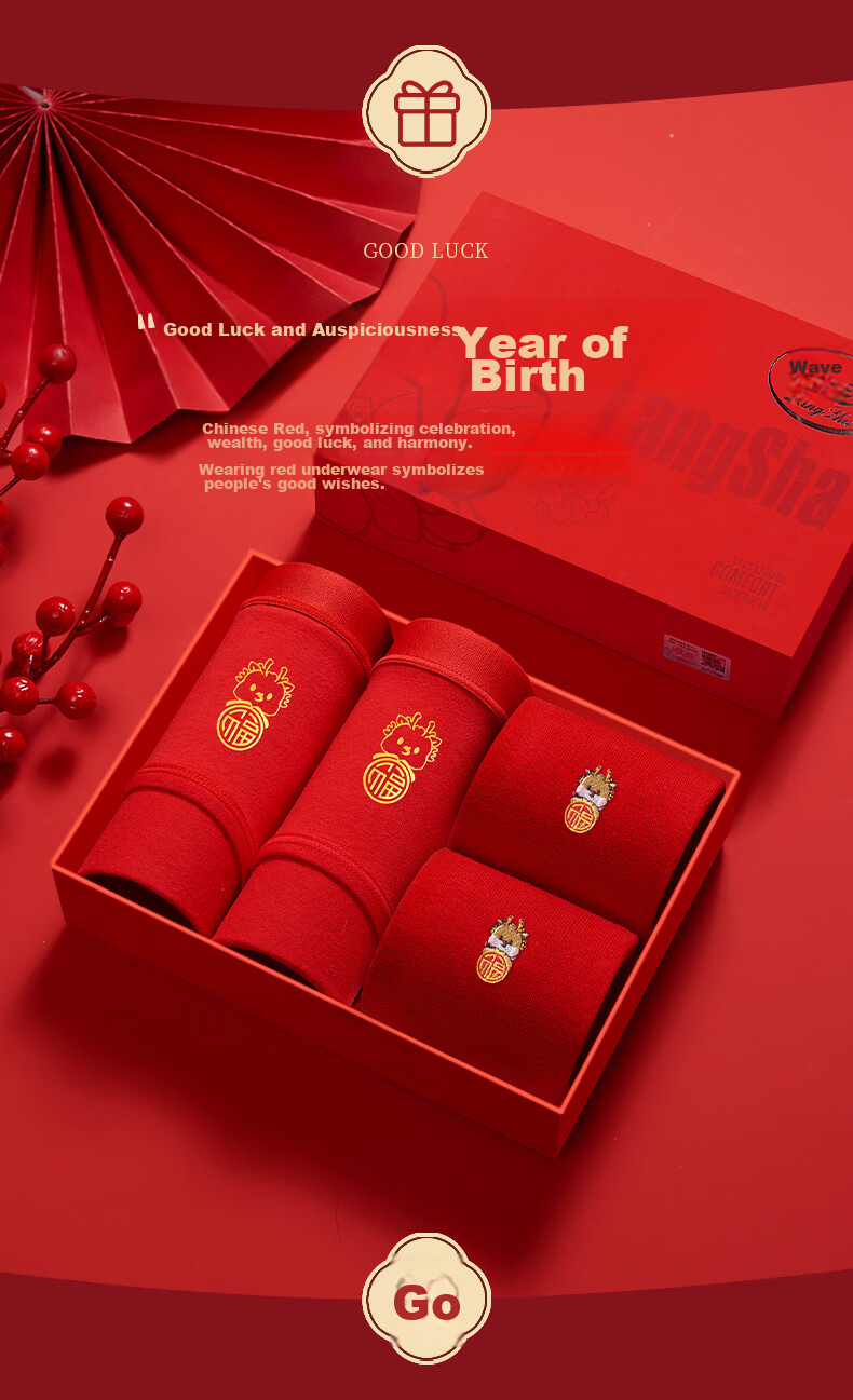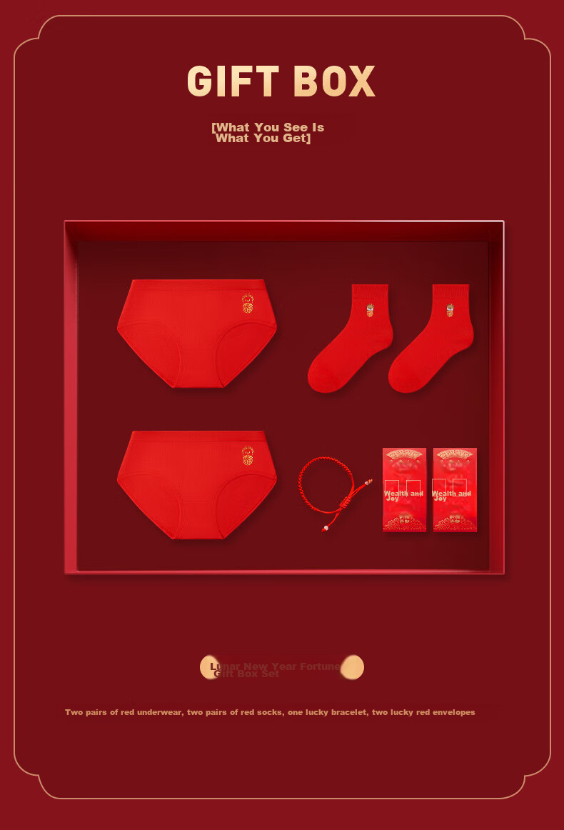 **Gift Box Contents:** 2 red underwear, 2 red socks, 1 lucky bracelet, 2 red envelopes