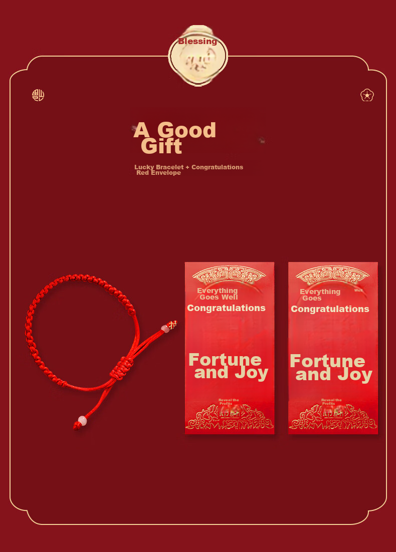 **Accessories:** Lucky bracelet and red envelopes for good luck and prosperity