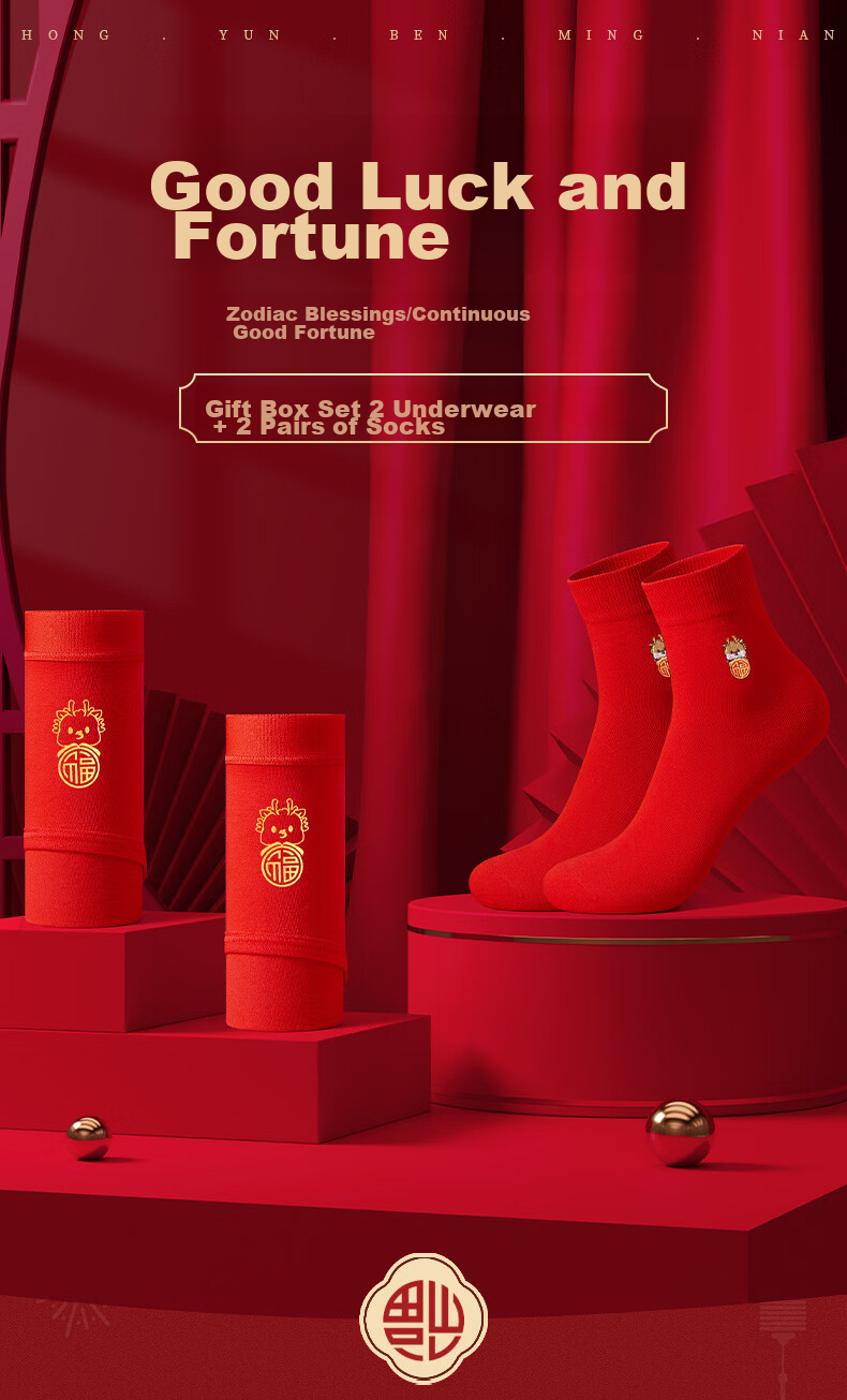 **Features:** Zodiac auspicious/Fortune continuous, gift box set with 2 underwear + 2 pairs of socks