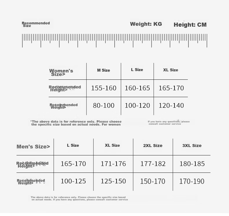 - Men: L (height: 165-170cm, weight: 100-125kg), XL (height: 171-176cm, weight: 125-150kg), 2XL (height: 177-182cm, weight: 150-170kg), 3XL (height: 180-185cm, weight: 170-190kg)