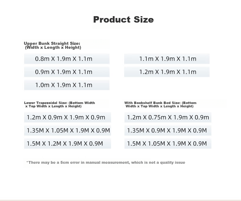 - Upper Bed Straight Size: 0.8mX1.9mX1.1m, 1.1mX1.9mX1.1m, 0.9mX1.9mX1.1m, 1.2mX1.9mX1.1m, 1.0mX1.9mX1.1m