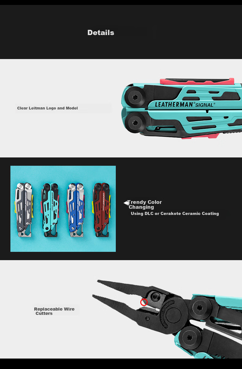 **Details:** LEATHERMAN logo and model, color-changing DLC or Cerakote ceramic coating, replaceable wire cutters