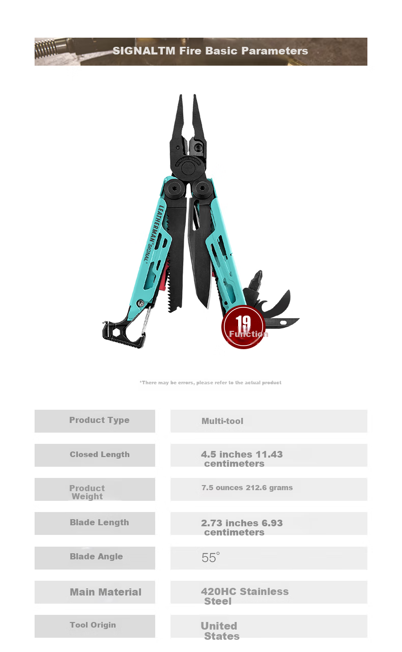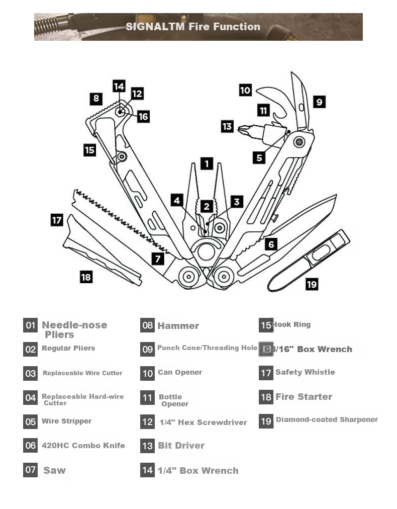 **Functions:** Pliers, hammer, carabiner, regular pliers, awl, hex wrench, needle-nose pliers, can opener, safety whistle, replaceable wire cutters, bottle opener, fire starter, wire stripper, diamond-coated sharpener, combination knife, bit driver, saw