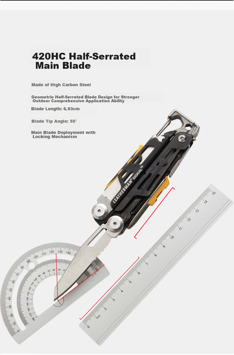 **Blade:** 420HC half-serrated blade with a length of 6.93cm, 55° angle, and locking mechanism