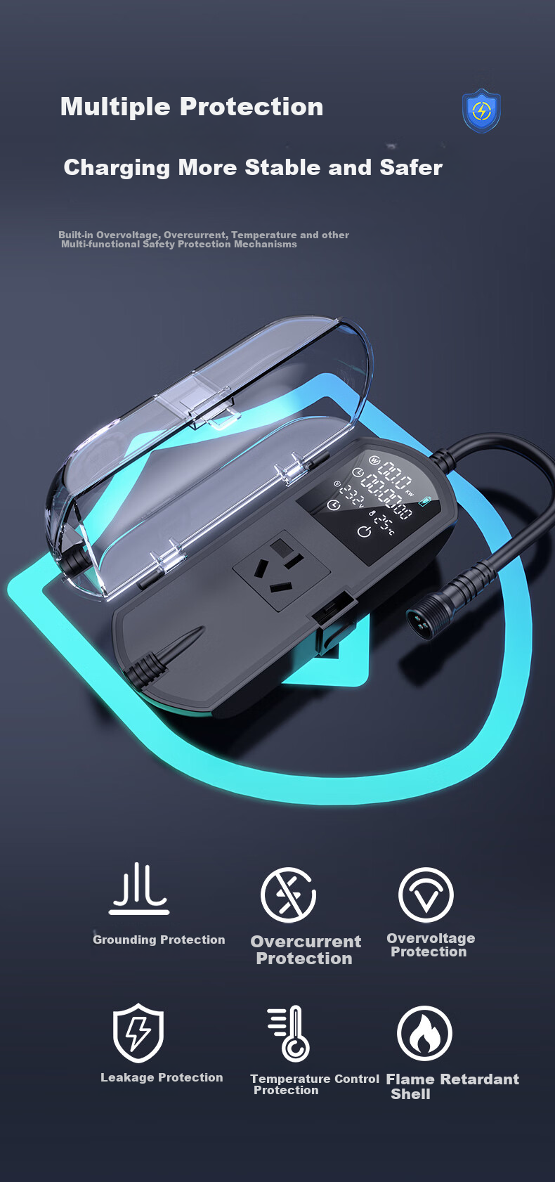 **Convenience:** Dynamic screen display, automatic detection/conversion, resolves issues with new energy charging guns not being able to charge from household sockets