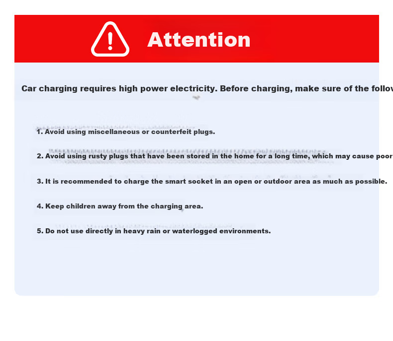 **Safety Precautions:** Avoid using counterfeit or rusty sockets, use in open or outdoor spaces, keep away from children during charging, do not use in heavy rain or waterlogged conditions