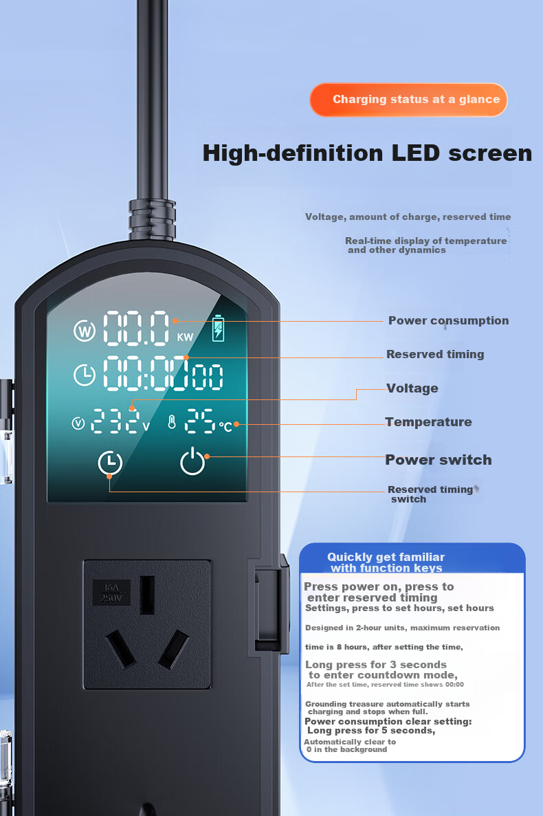 **User-Friendly:** Clear LED display for real-time monitoring of voltage, charge level, reservation time, and temperature