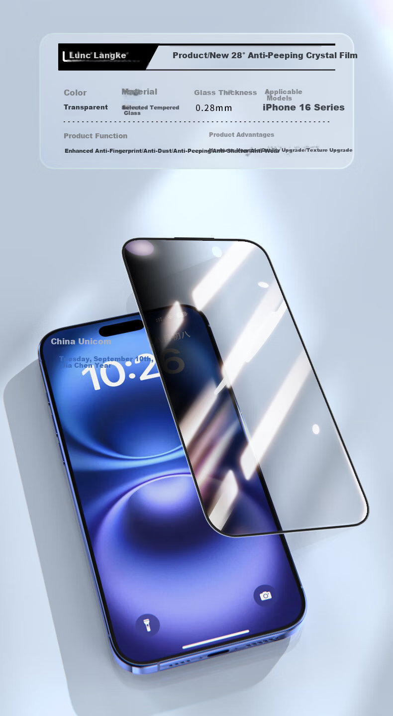**Product Name:** 28° Privacy Screen Protector for iPhone 16/15 Series