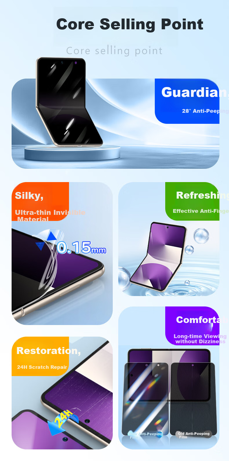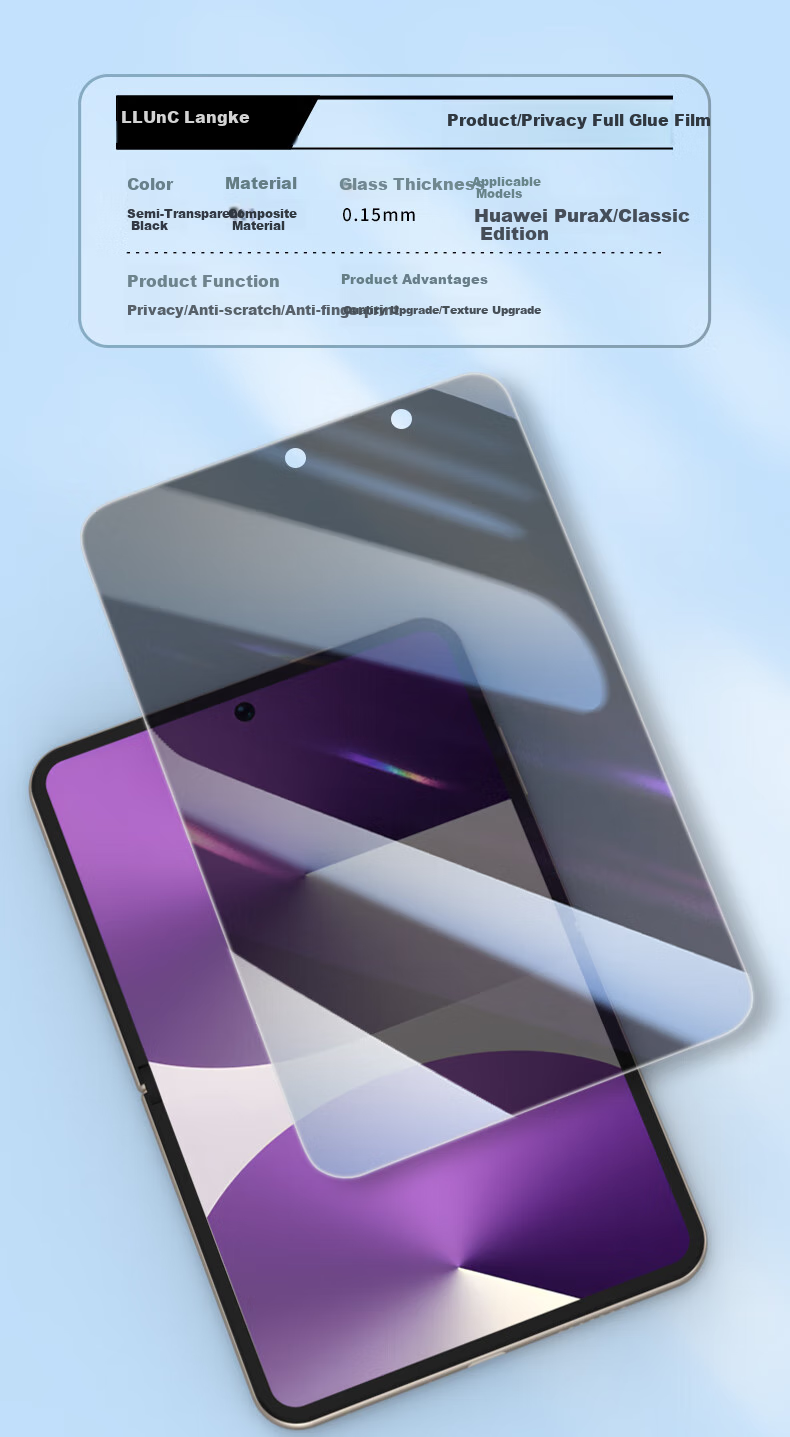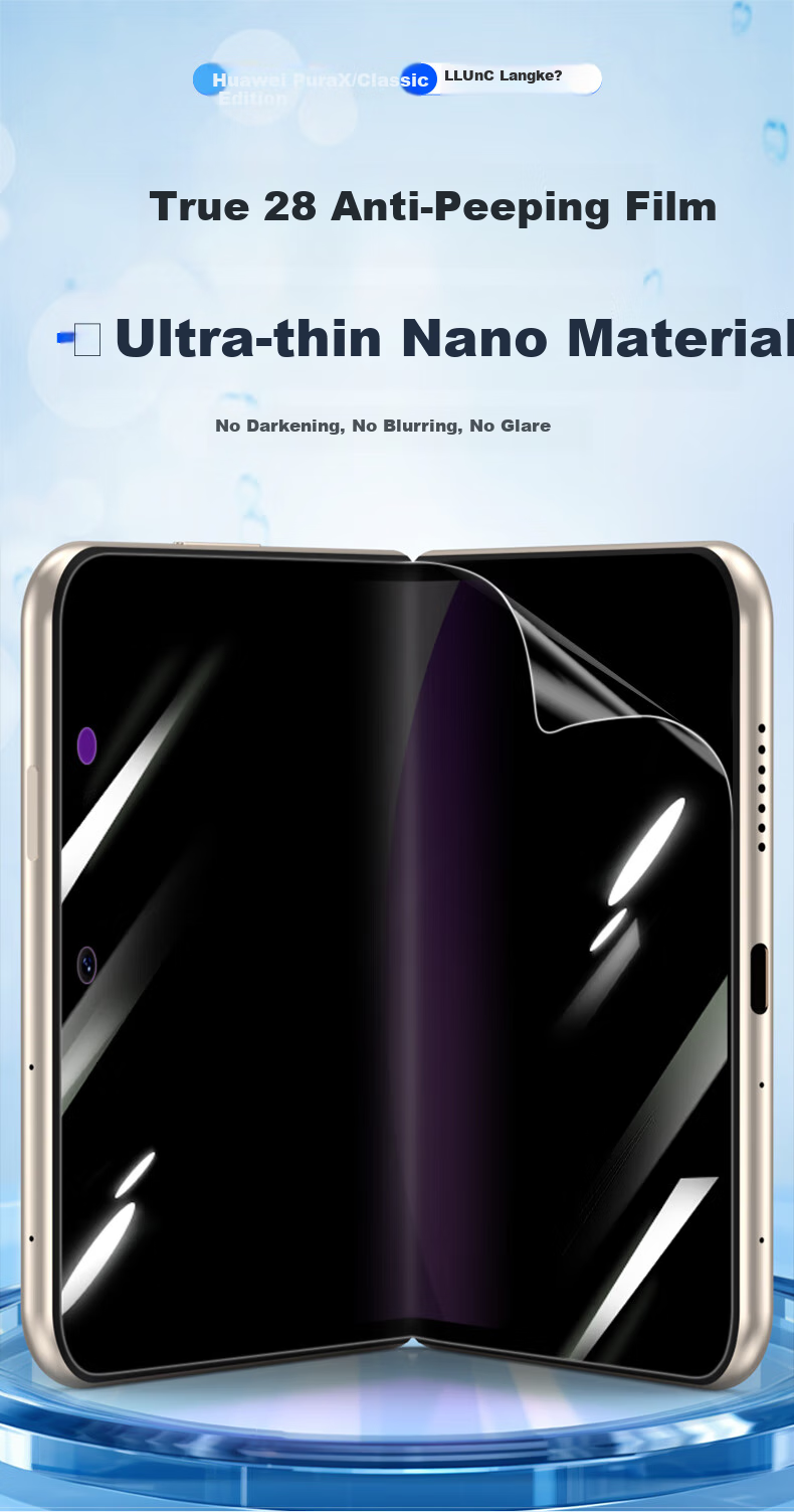 - Core Selling Points: Privacy protection, silky smooth, refreshing, ultra-thin invisible material, strong fingerprint resistance, 0.15mm thickness, comfortable, long-term viewing without dizziness, 24H scratch repair, suitable for Huawei PuraX/Classic Edition