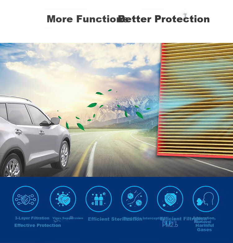High efficiency in filtering PM2.5 particles, sterilization, odor absorption, PM0.3 particle filtration, dust mite allergen interception, TVOC removal, formaldehyde filtration