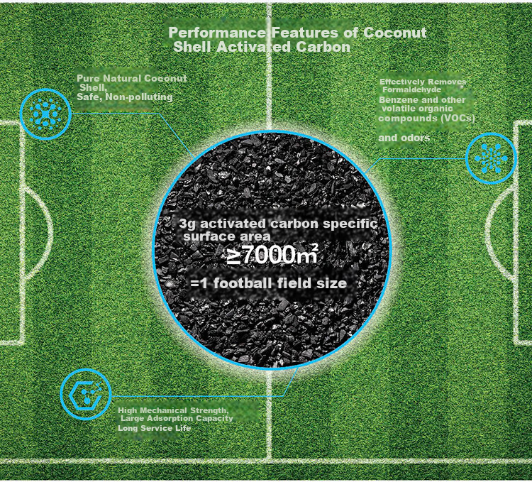 Coconut shell activated carbon features: natural coconut shell, effective formaldehyde removal, safe and pollution-free, high mechanical strength, large adsorption capacity, long service life